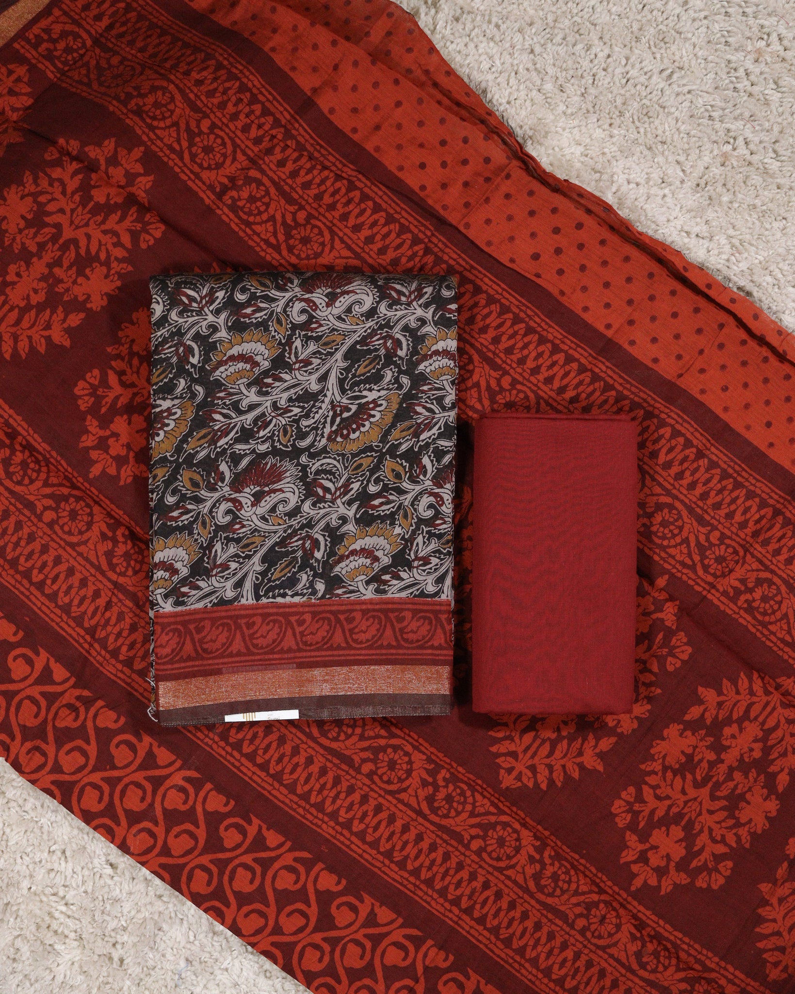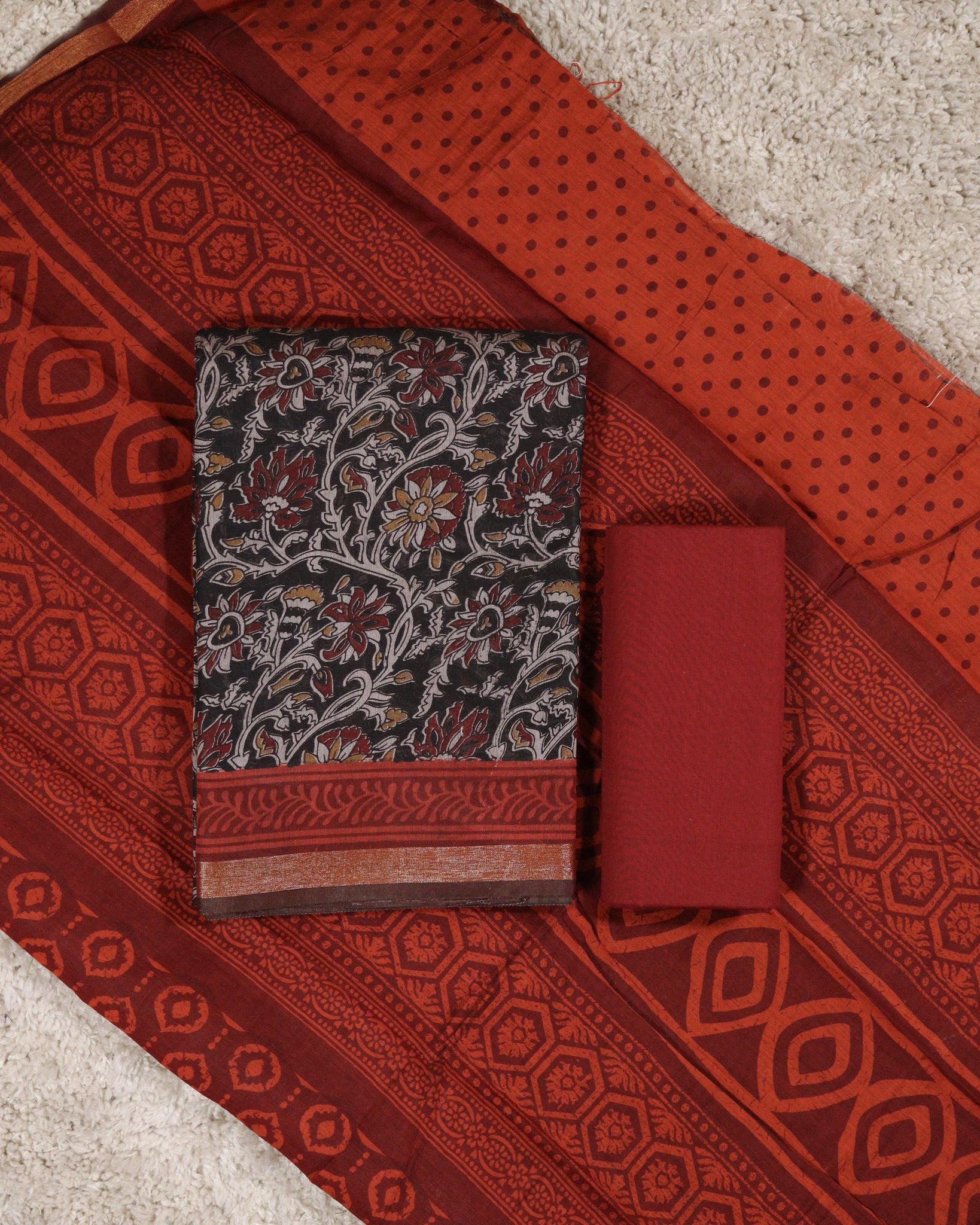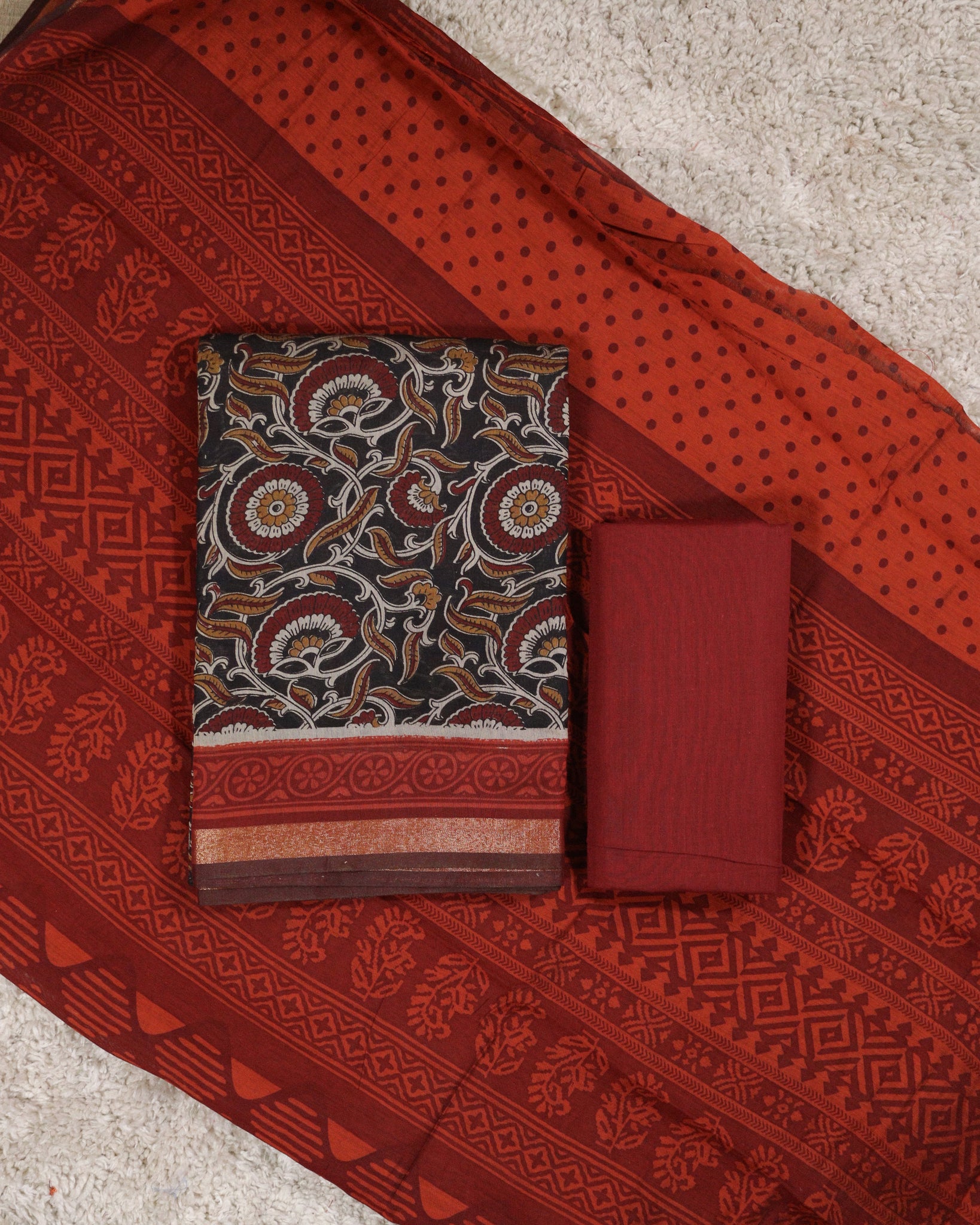 Dupatta: Semi maheshwari silk dupatta in maroon and burnt orange combination with allover printed detailing and boarder. Length: 2.50mtr