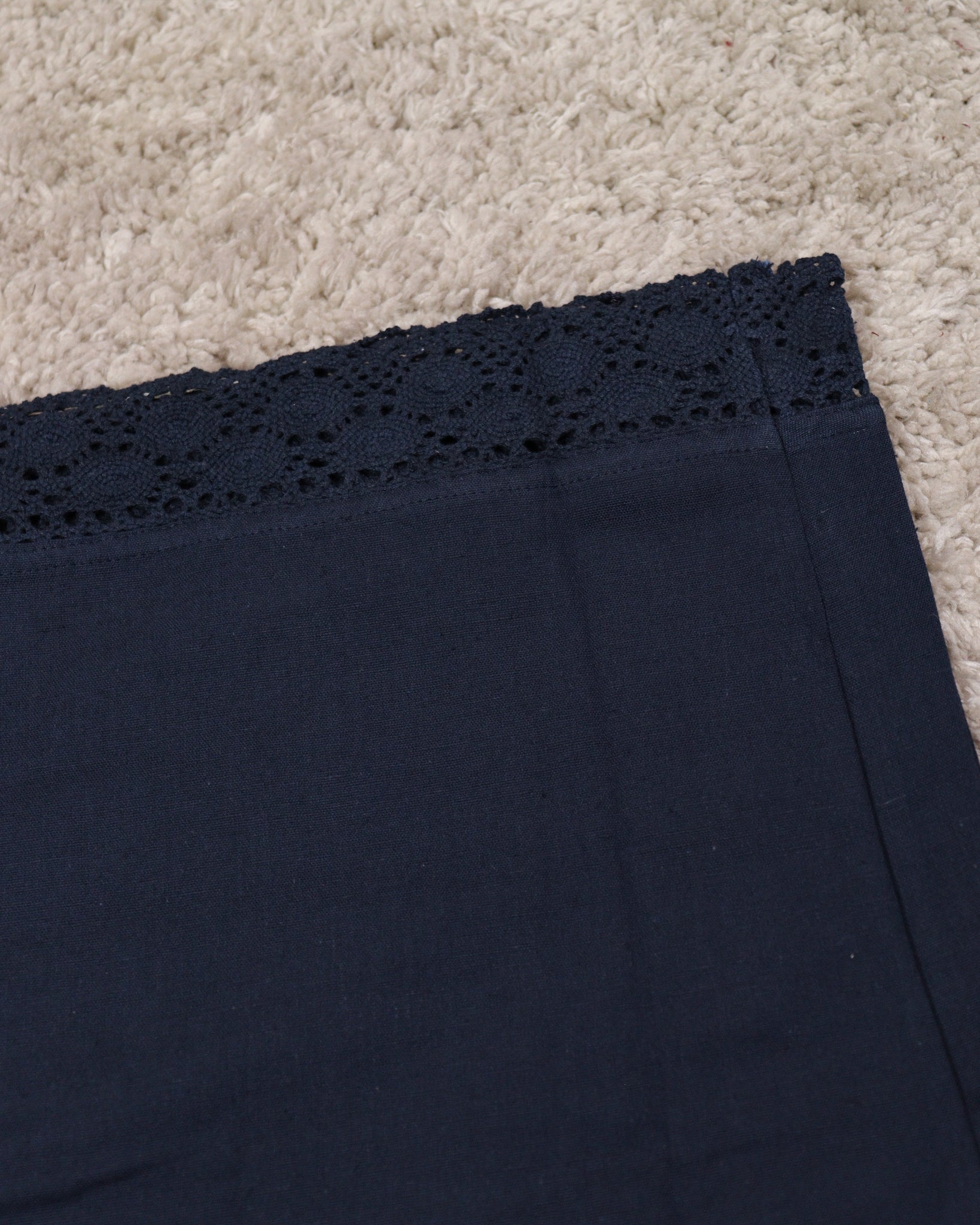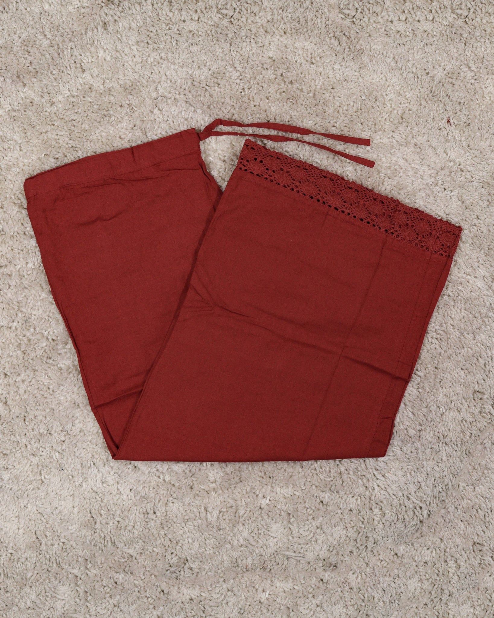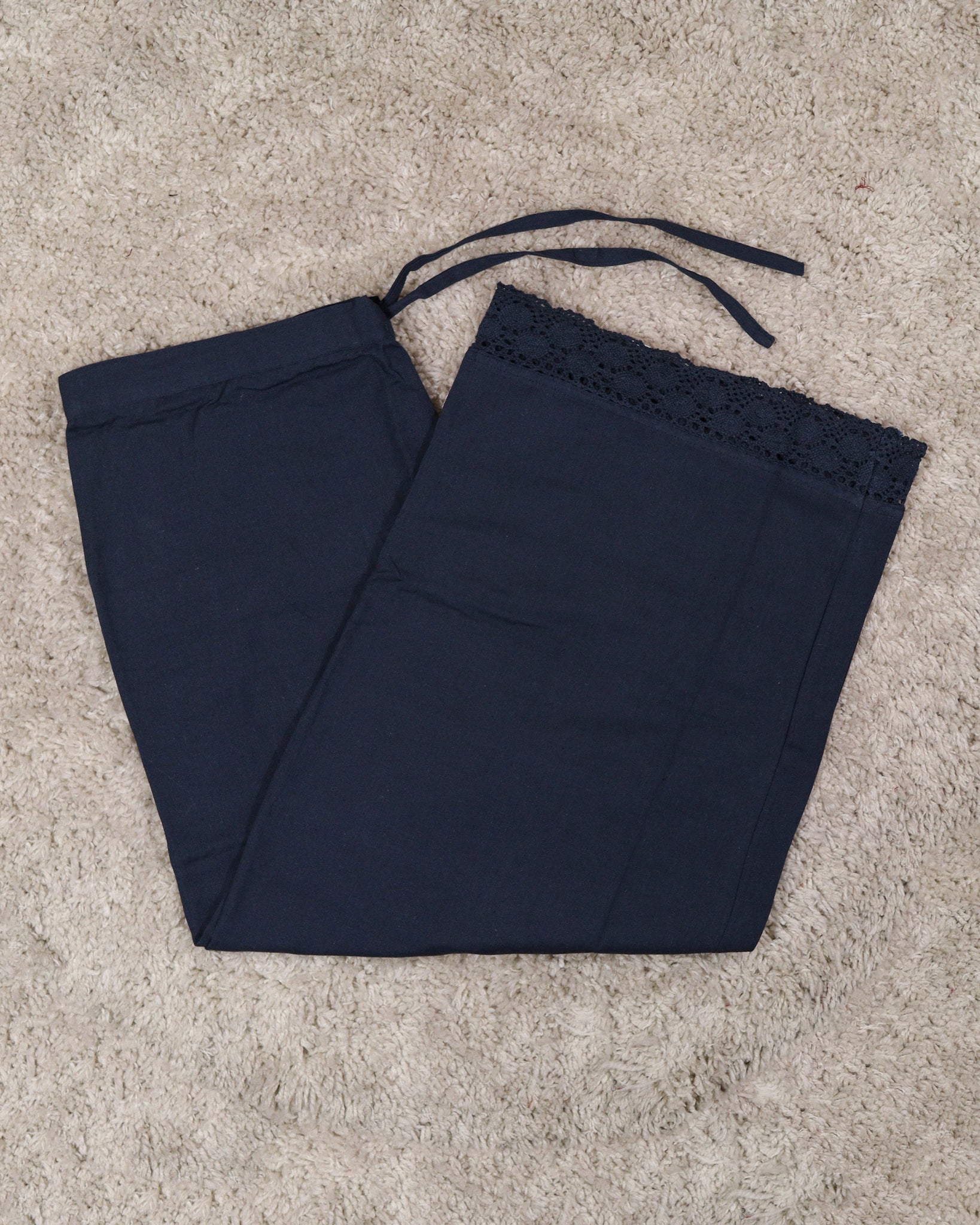Flared parallel bottom. Ends finished with lace. Waist-Front band and back elastic.