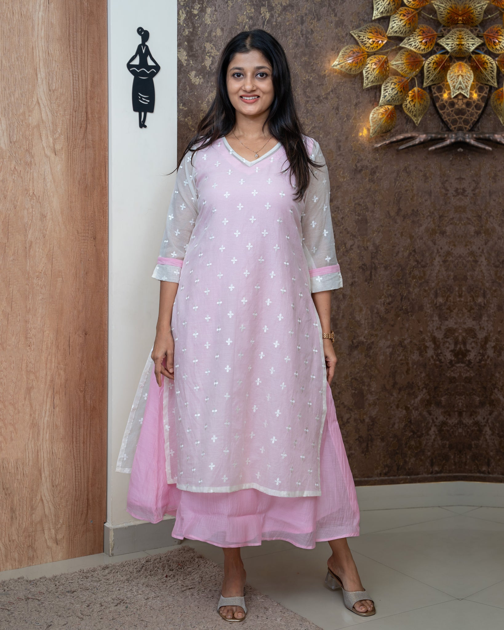 Outer wear: Crafted in mul chanderi with allover self thread embroidery motifs. Sleeve ends features a contrast double pleats. Without lining.