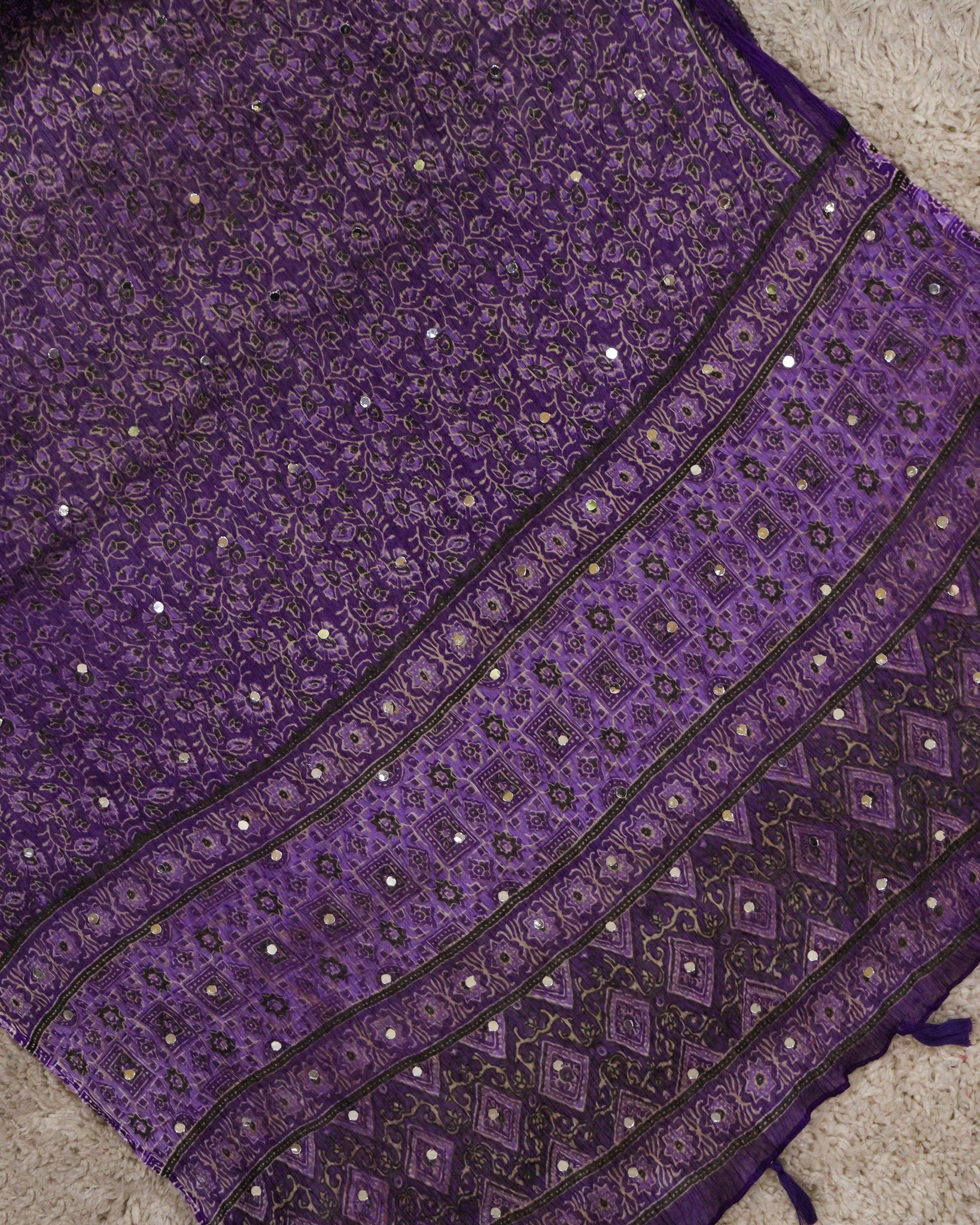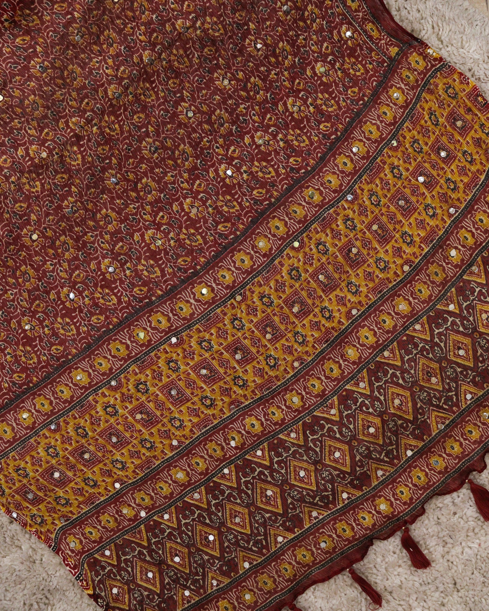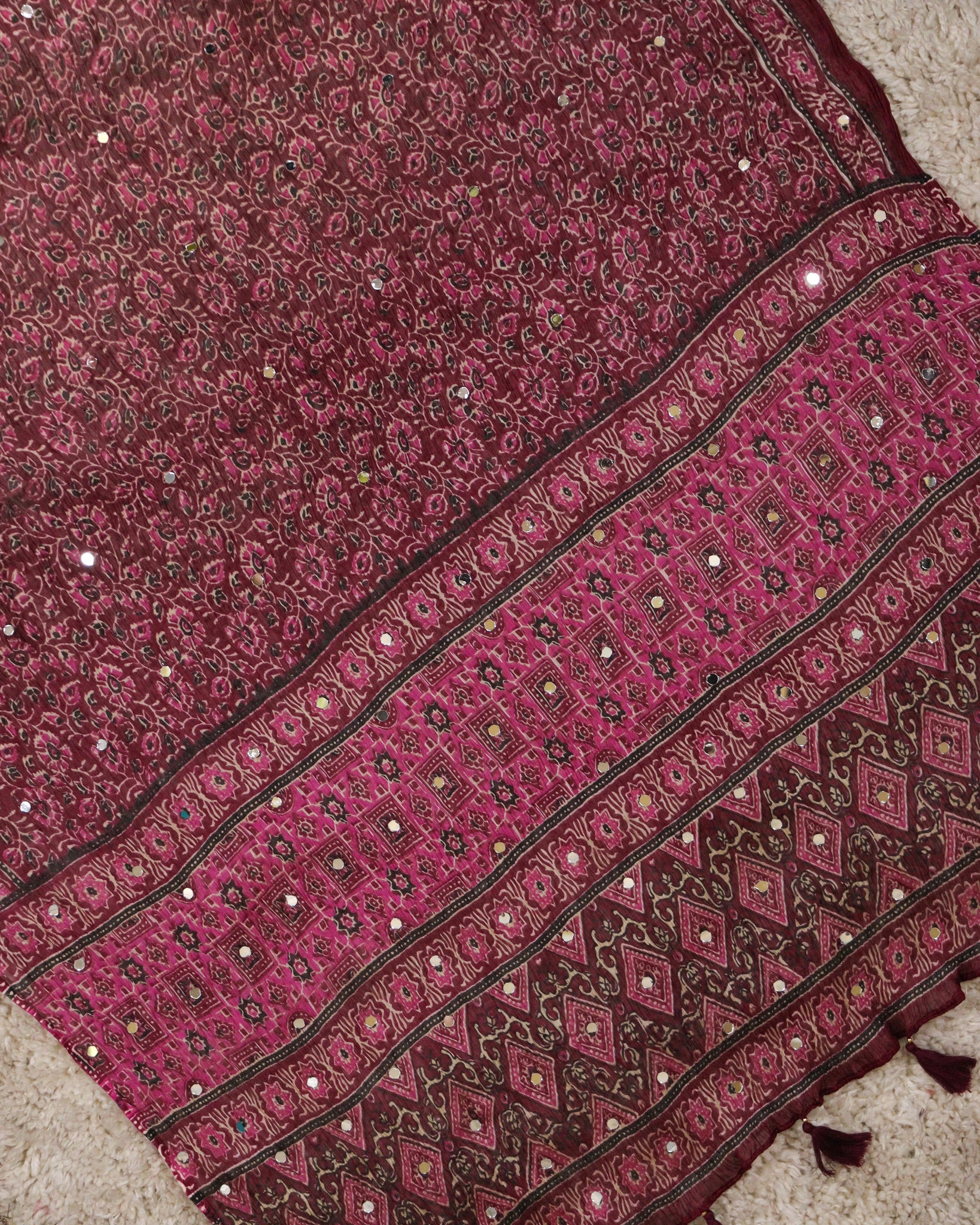 Chiffon fabric with allover digital floral prints embellished with glass mirror work. End finished with tassels. Length:2.35mtr.