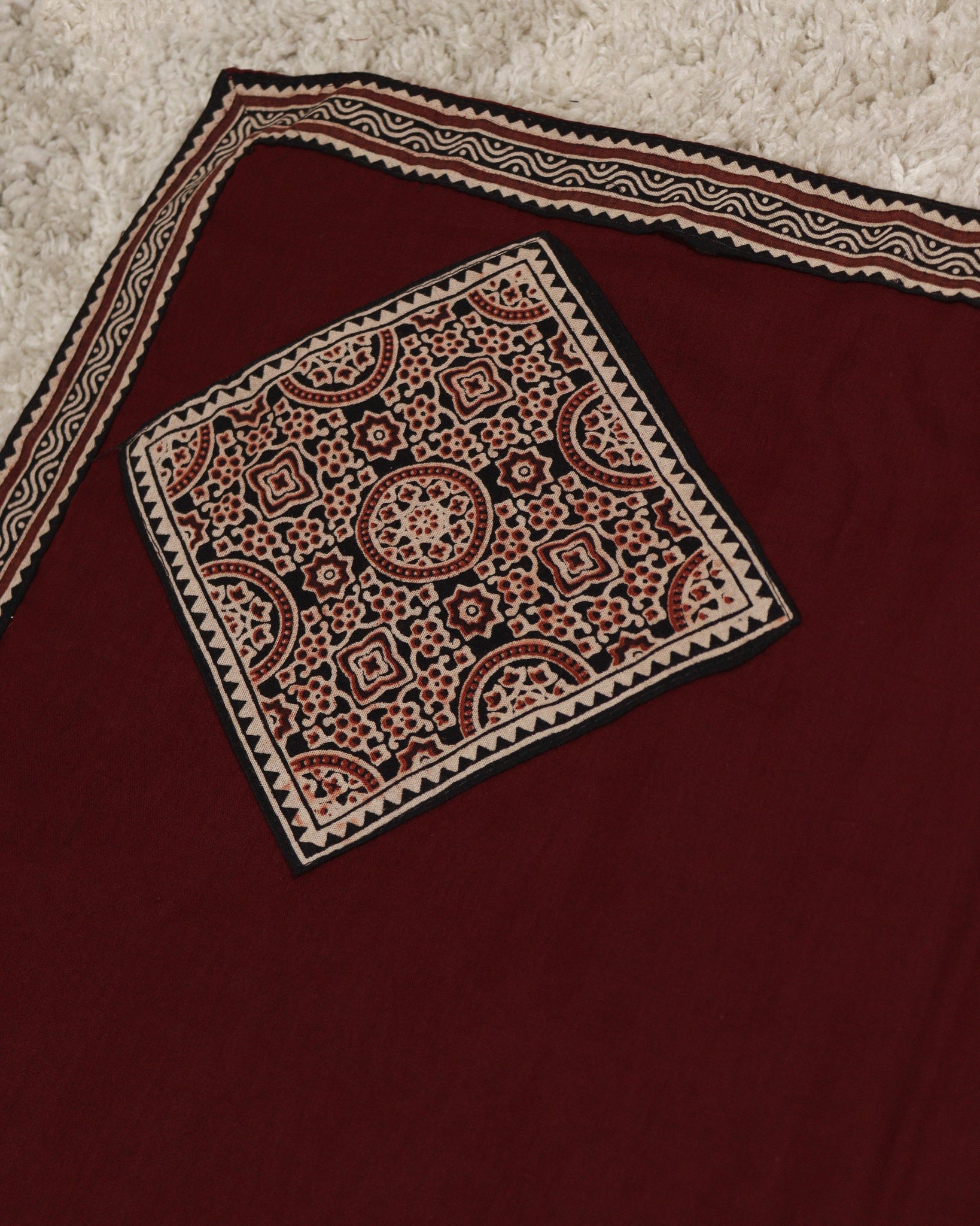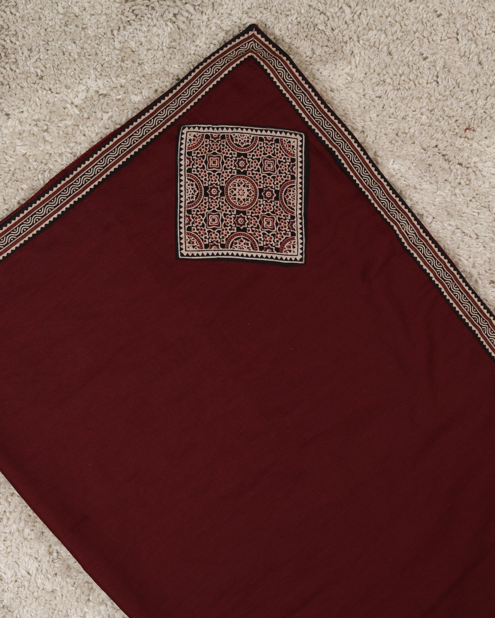 Mul cotton dupatta with patch work pattern and boarder in ajrak printed fabric.
