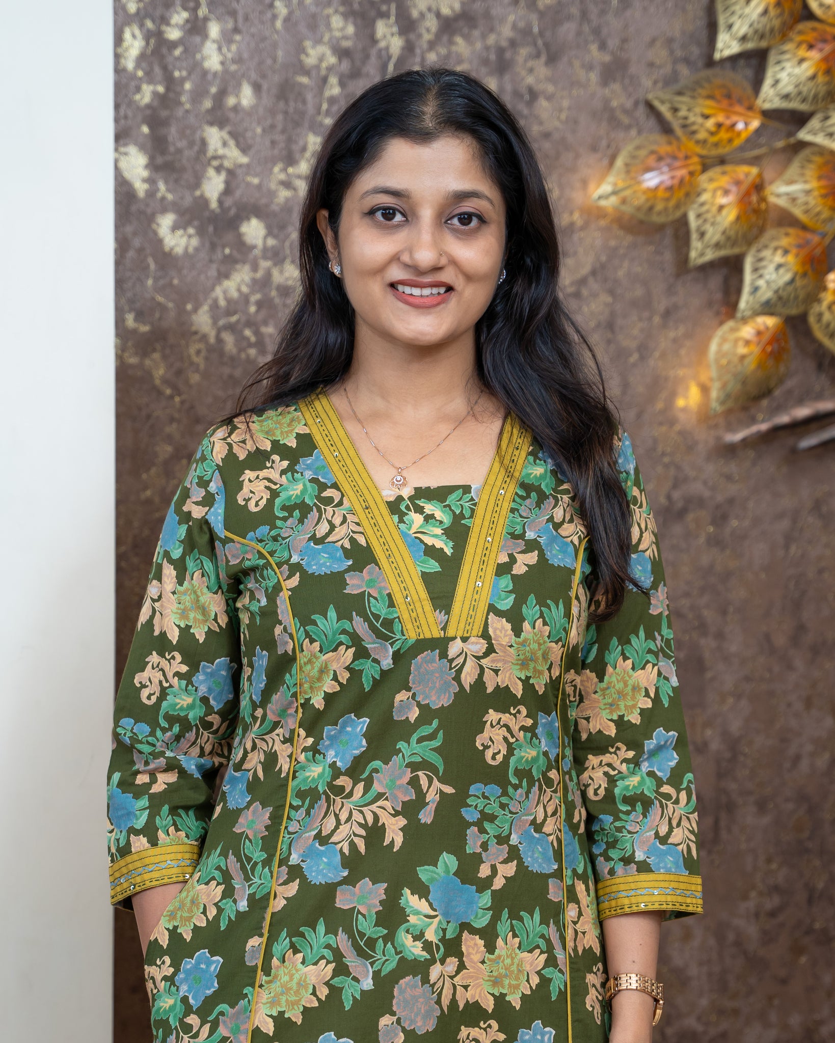 Top: Printed cotton slitted A-line kurti. Princess cut highlighted with piping. Neck features a band pattern. Sleeve ends finished with boarder. Without lining.