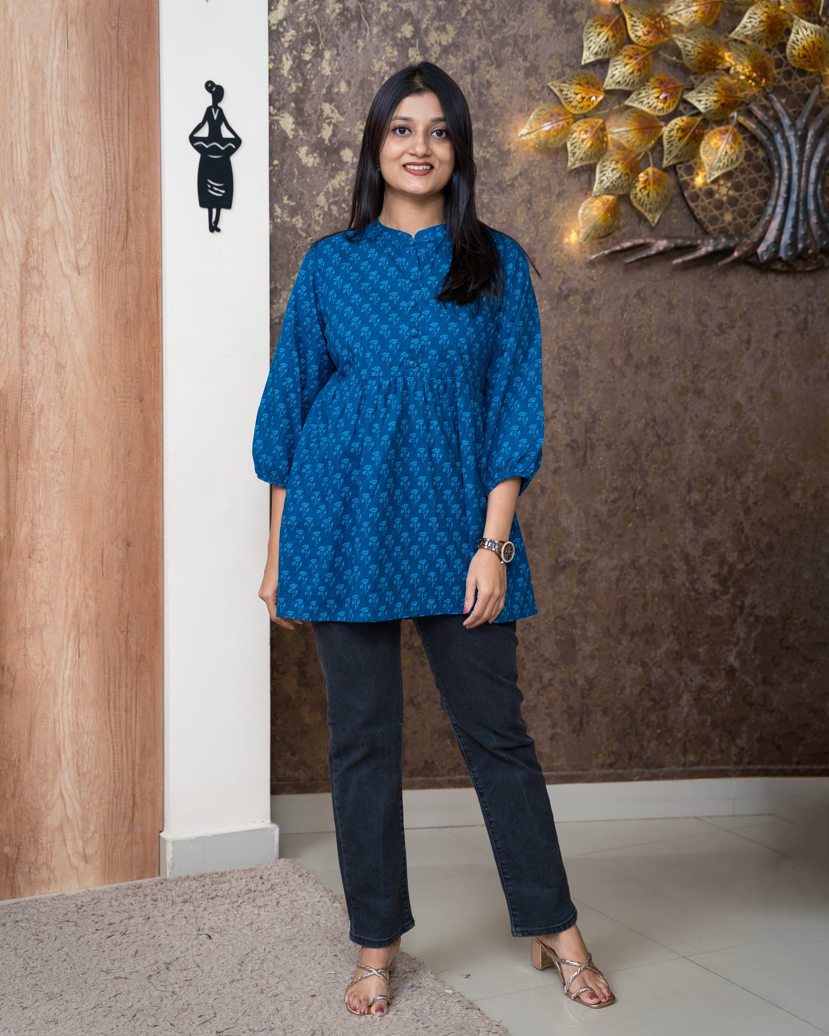 Top : Printed cotton kurti . Featuring an elegant front neck placket with decorative show buttons, Sleeves finished with elastic cuffs . minimal gathers at front and back portion. Without lining.