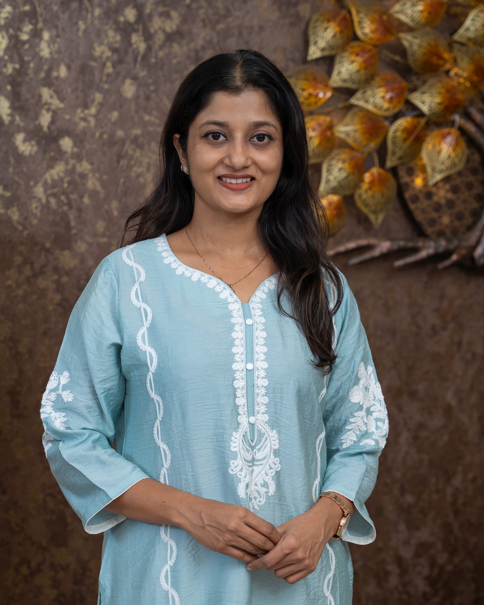 Top: Crushed semi silk slitted kurti. Allover embroidery detailing on front. Sleeves also features a embroidered motif. Back plain. Without lining.