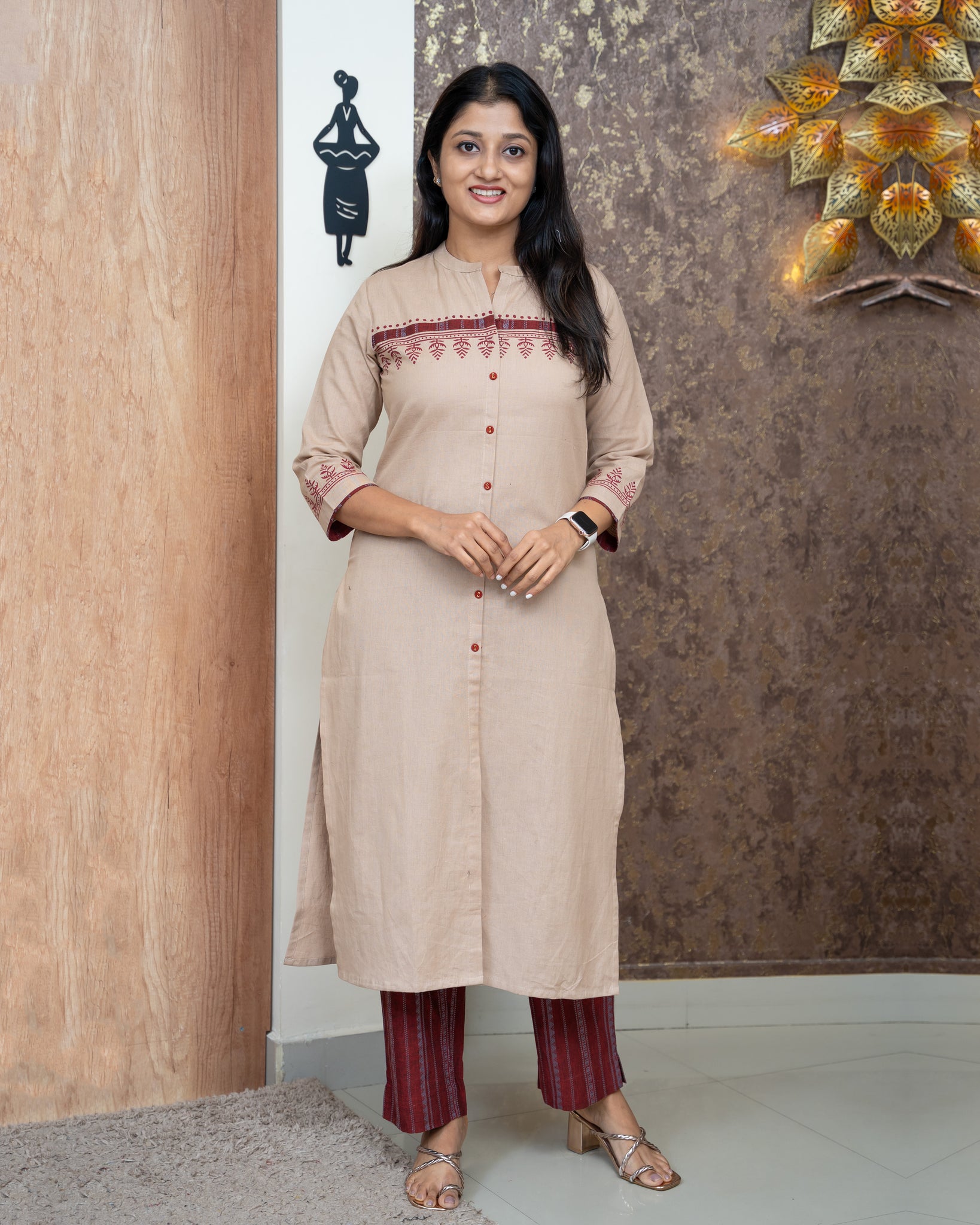 Top: Cotton slitted kurti. Full round collar with placket pattern and buttons attached. Yoke and sleeve ends highlighted with block prints. Without lining.