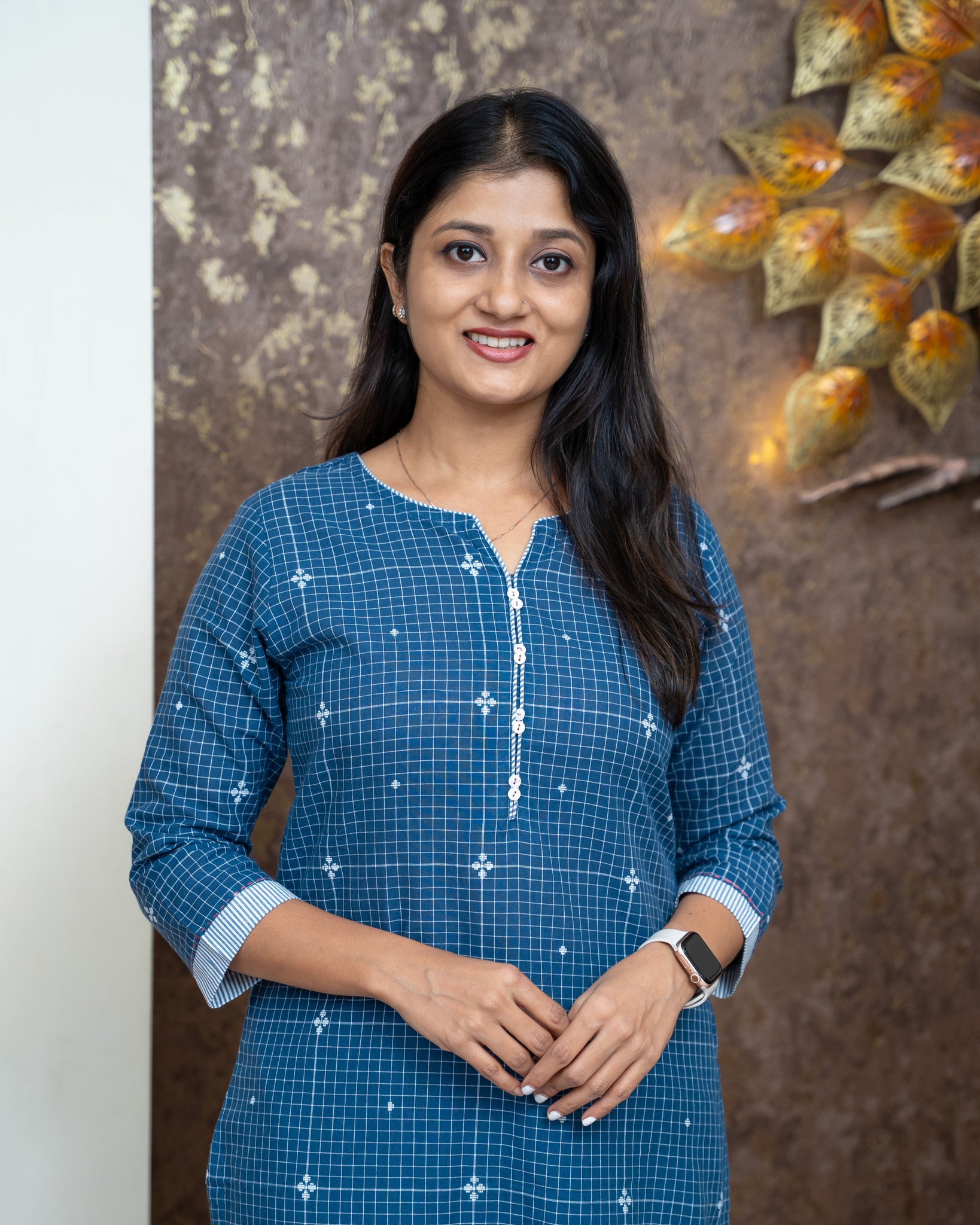 Top: Cotton slitted kurti. Allover chec woven pattern. Yoke features a contrast piping and button detailing. Sleeve ends finished with boarder. Without lining.