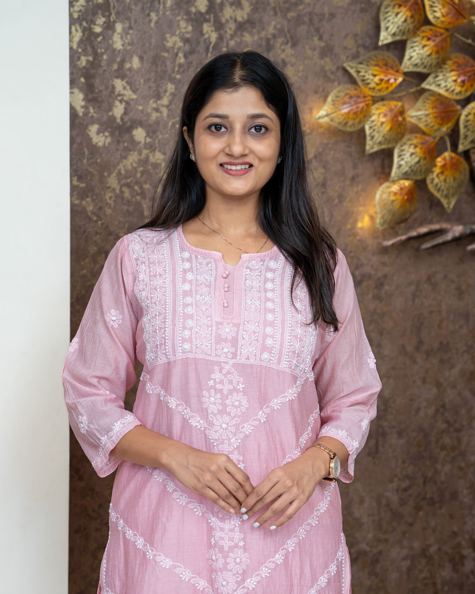 Top: Mul chanderi slitted kurti. Allover hand chikenkari embroidery detailing. Yoke highlghted with potli button details. Without lining.