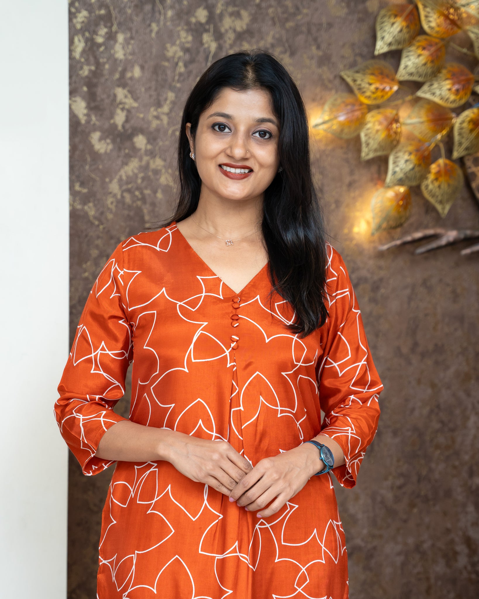 Top: Muslin silk slitted kurti. Yoke features a box pleat and button detailing. Hemline with a curved pattern. Without lining.