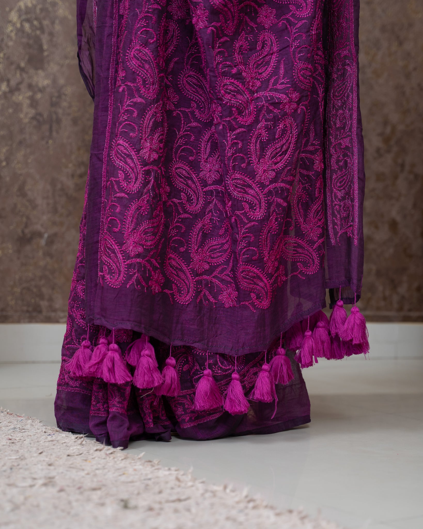 Mul cotton saree with allover thread work detailing. Pallu finished with tassels. Without blouse.