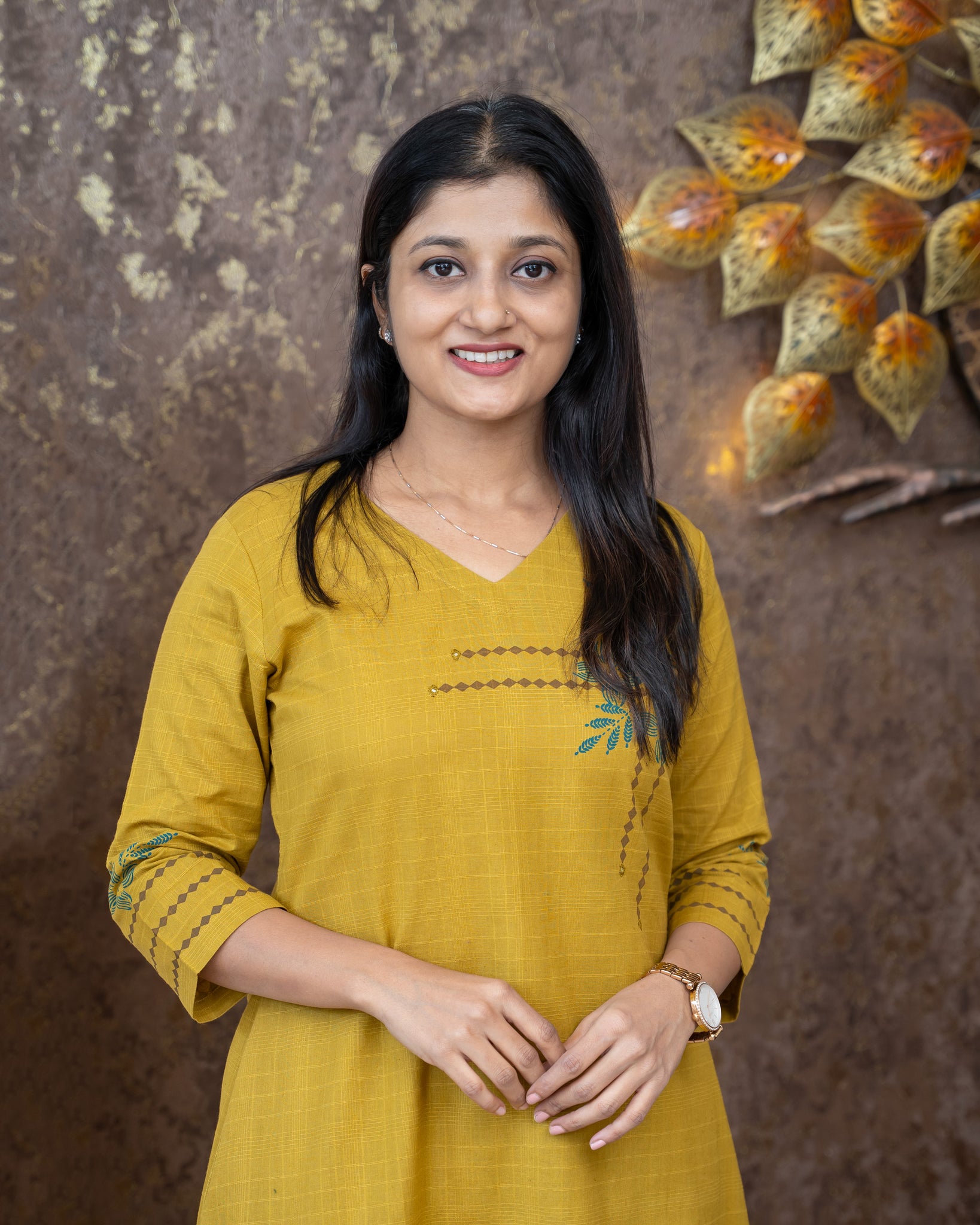 Top: Cotton slitted A-line kurti. Allover check woven pattern. Front features block prints and mirror work. Sleeve ends also highlighted with block prints. One side pocket. Without lining.
