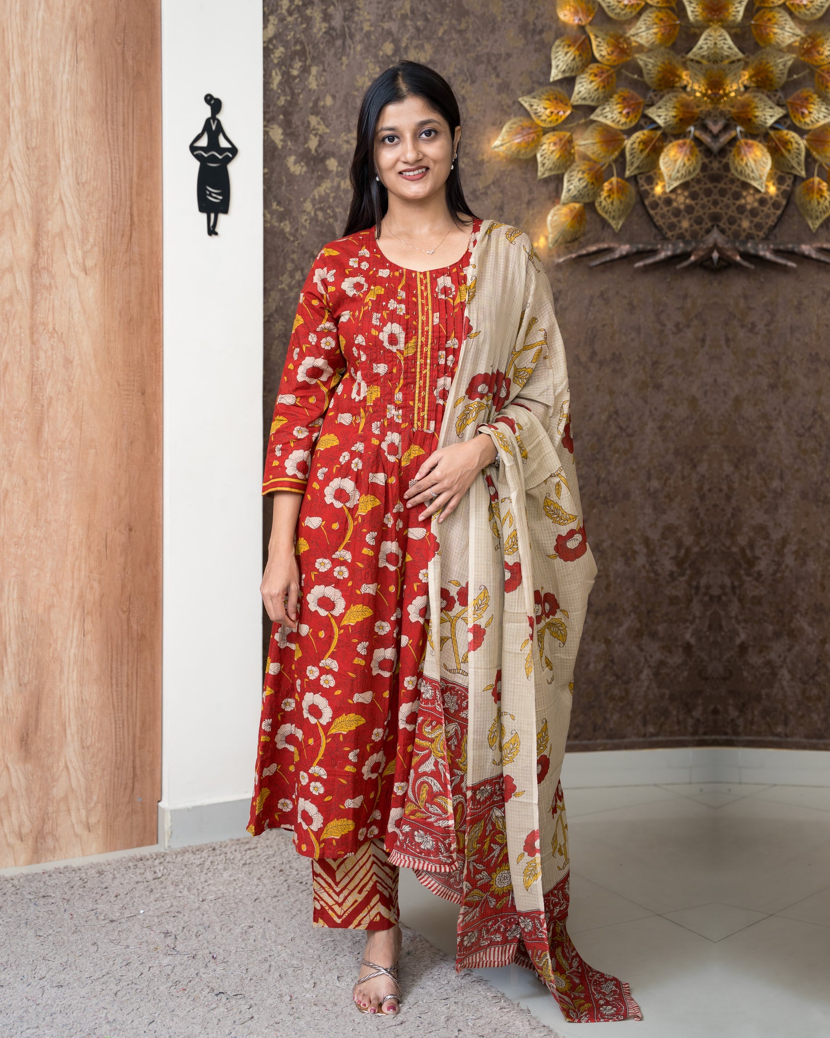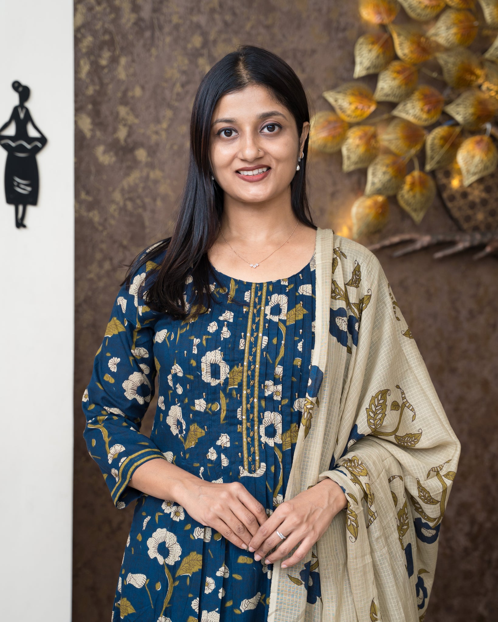 Top: Printed cotton A-line kurti. Yoke highlighted with pleats and hand work. Without lining.