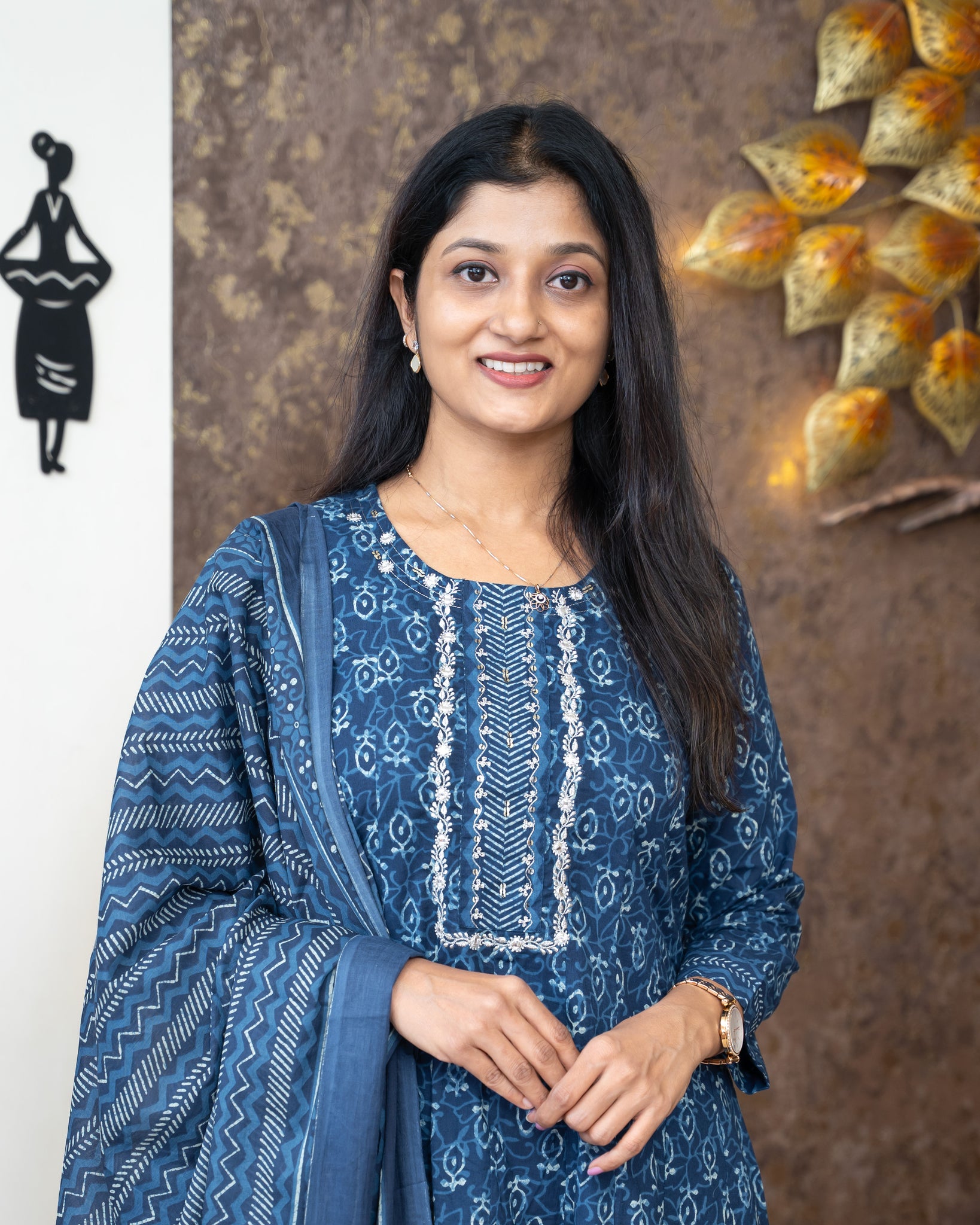 Dupatta: Mul cotton fabric enhanced with block prints. Length 2.25 meter