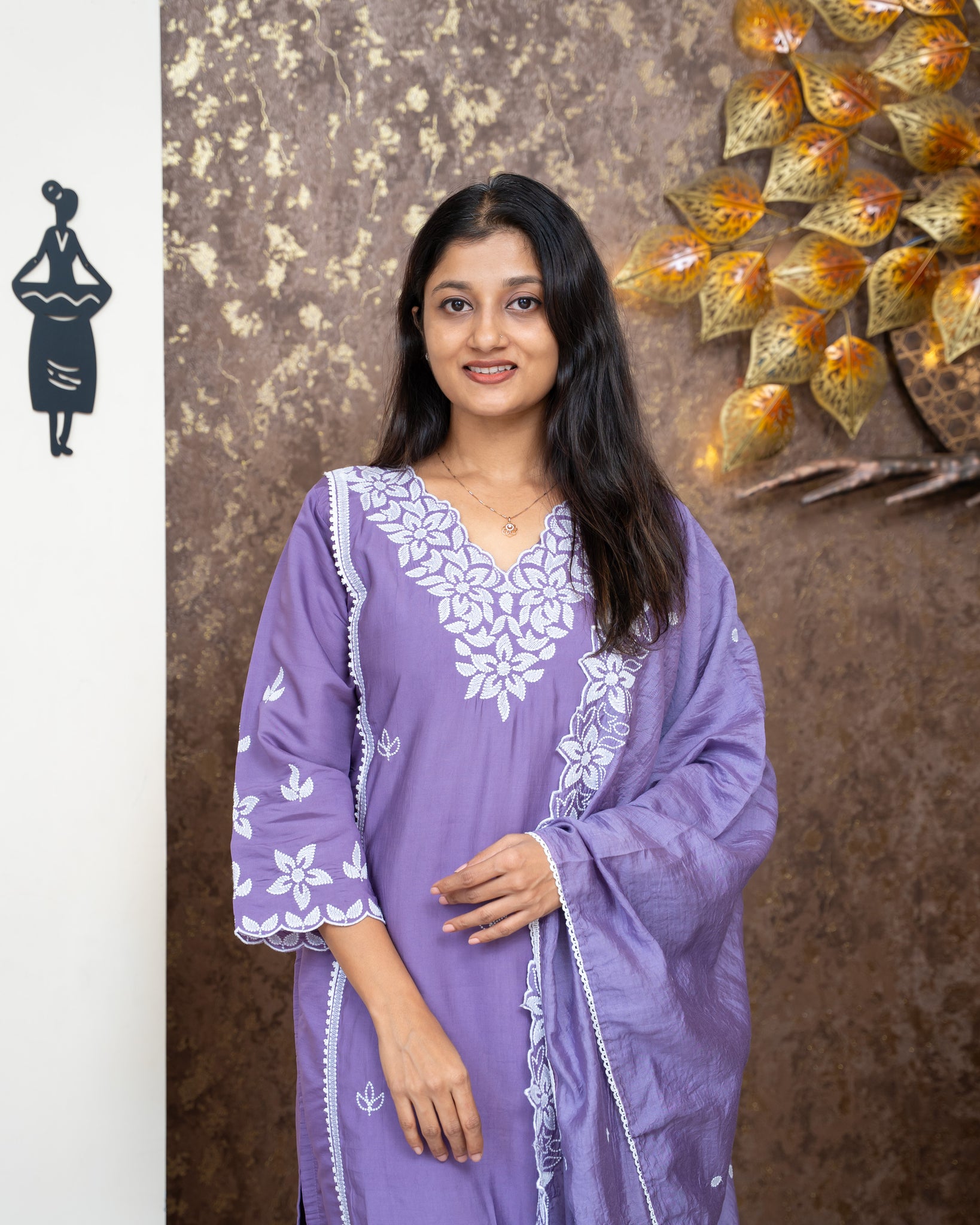 Dupatta: Chanderi dupatta. One side finished with embroidery pattern. The other three sides finished with lace. Length: 2.20mtr