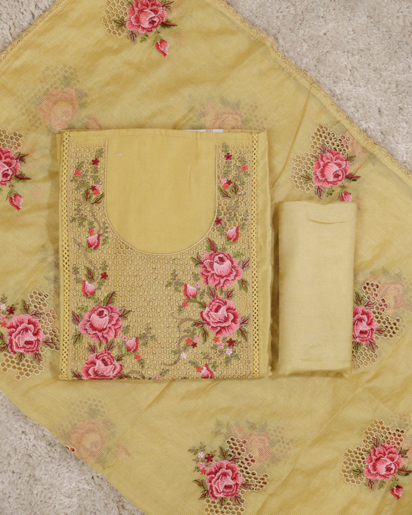 Top: Plain Chanderi Silk fabric. Round neck pattern. Yoke box pattern enhanced with cut work, self and contrast thread floral embroidery work and crochet lace detailing. Length:2.40mtr.