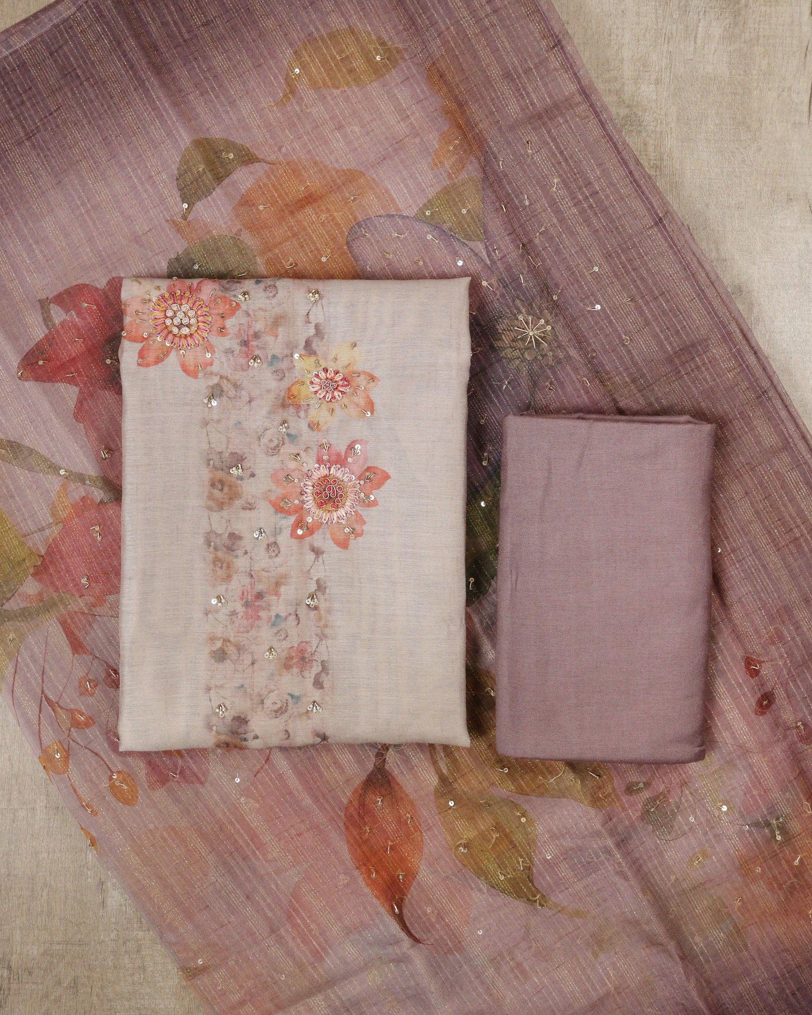 Top: Chanderi Silk fabric with allover gradation. yoke enhanced with floral digital print highlighting hand work. length:2.50mtr.