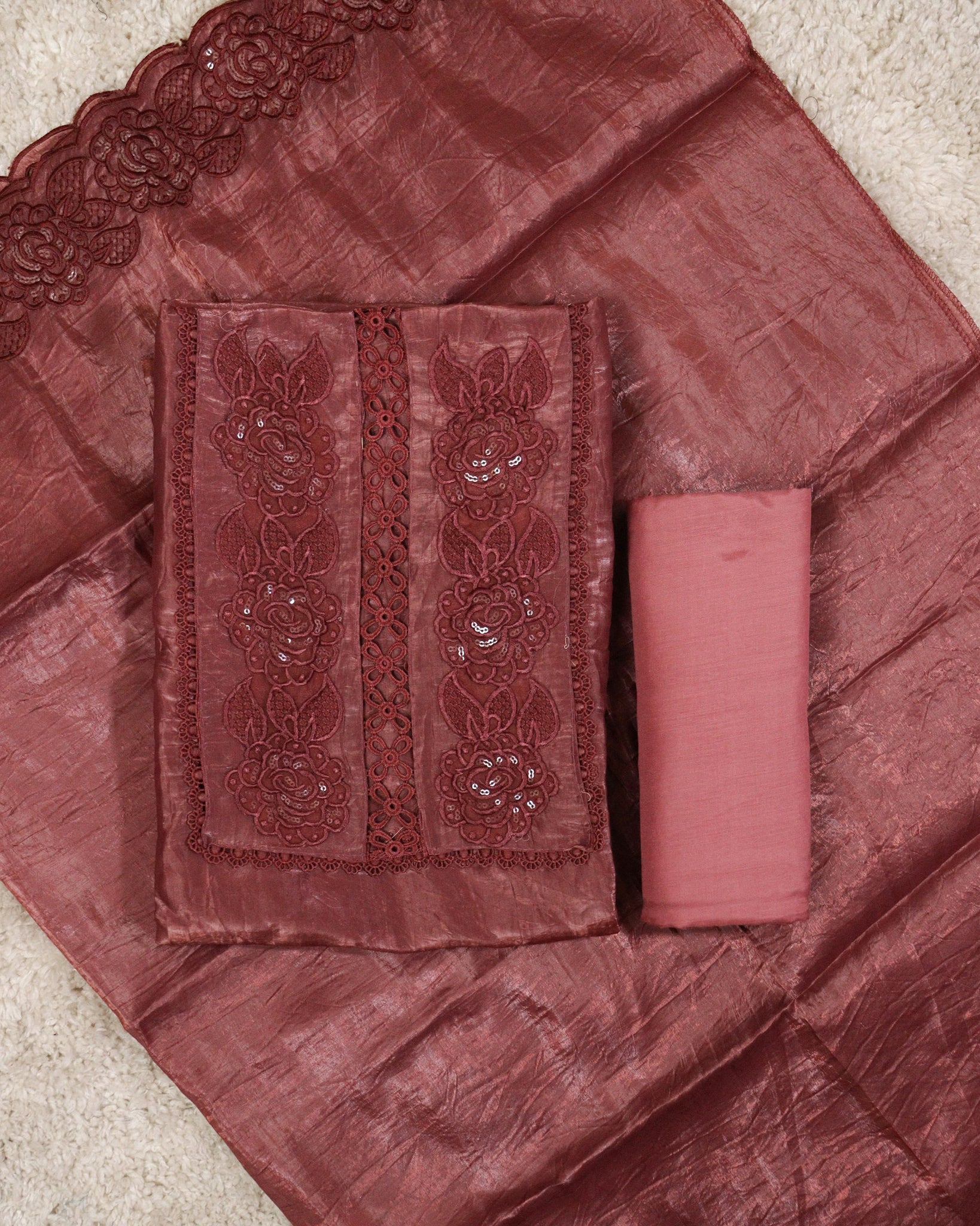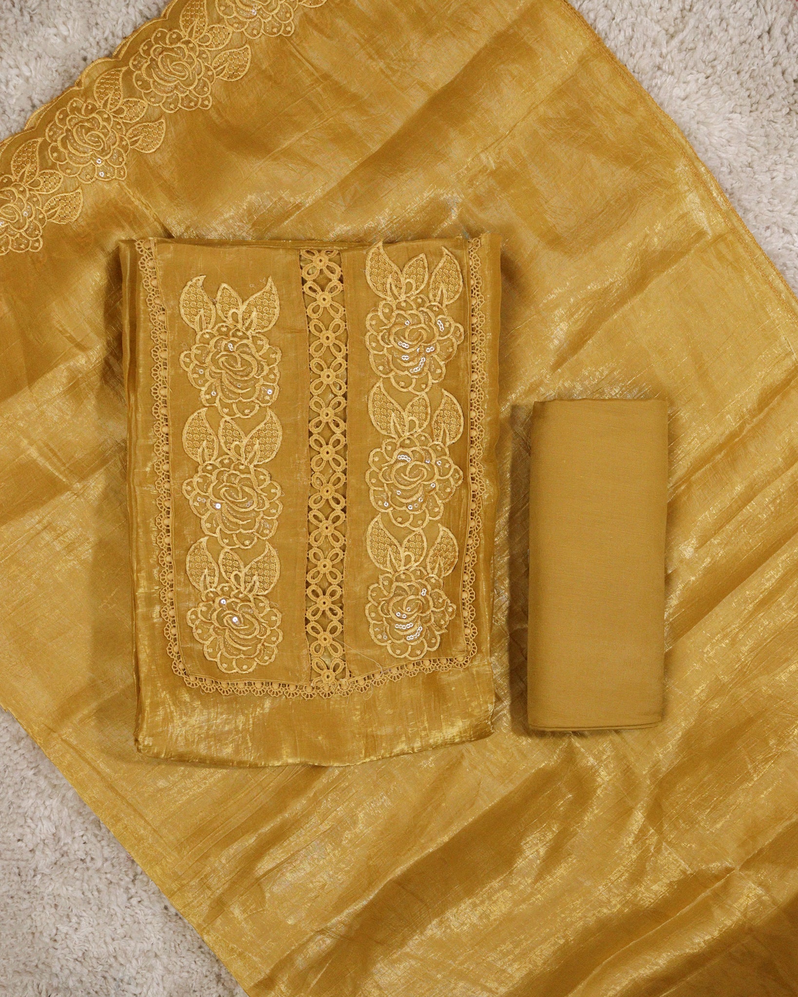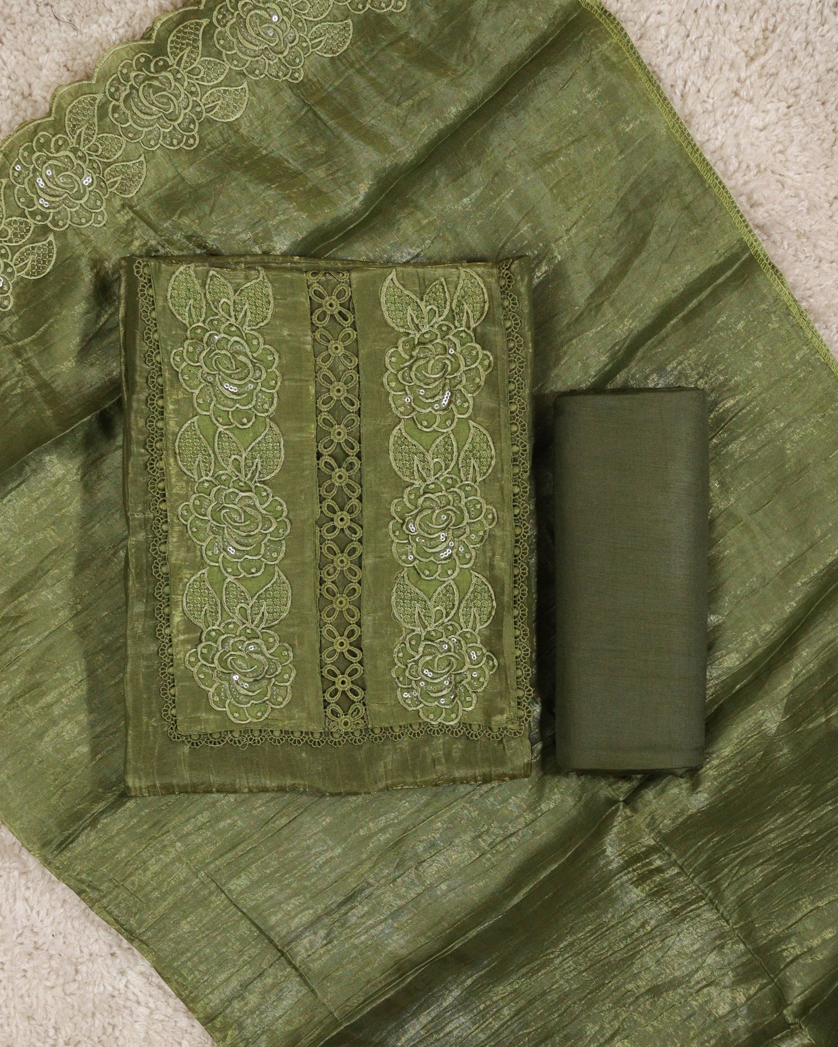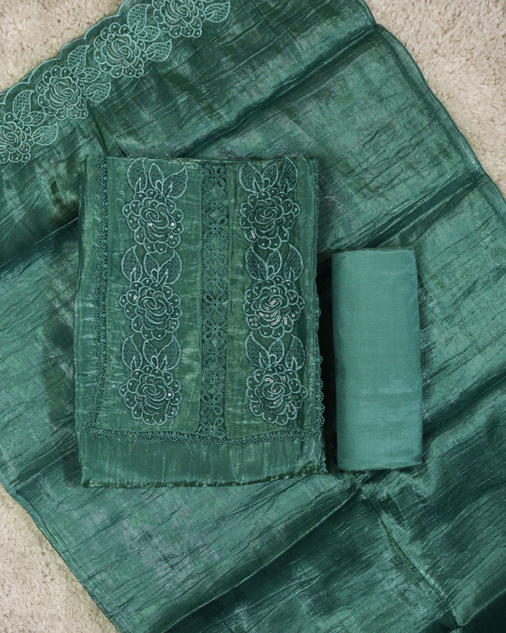 Top: Crushed satin organza fabric. Yoke box pattern enhanced with applique work and crochet lace. Length:2.40mtr, Width:1.15mtr