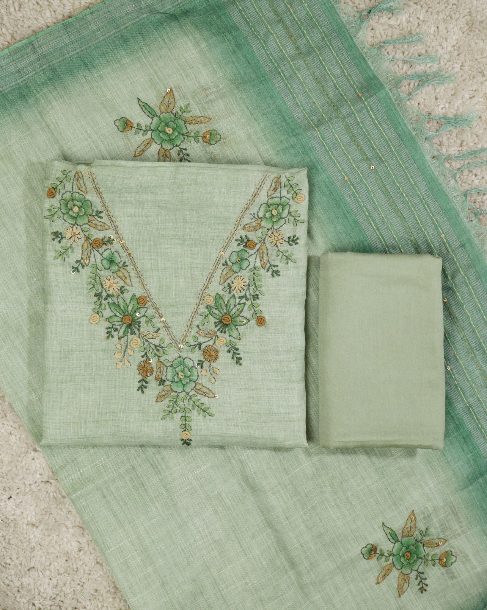 Top: Linen Cotton fabric. V-Neck and hemline enhanced with hand painting, highlighting kantha stitches and Sequins work. Length:2.40mtr.