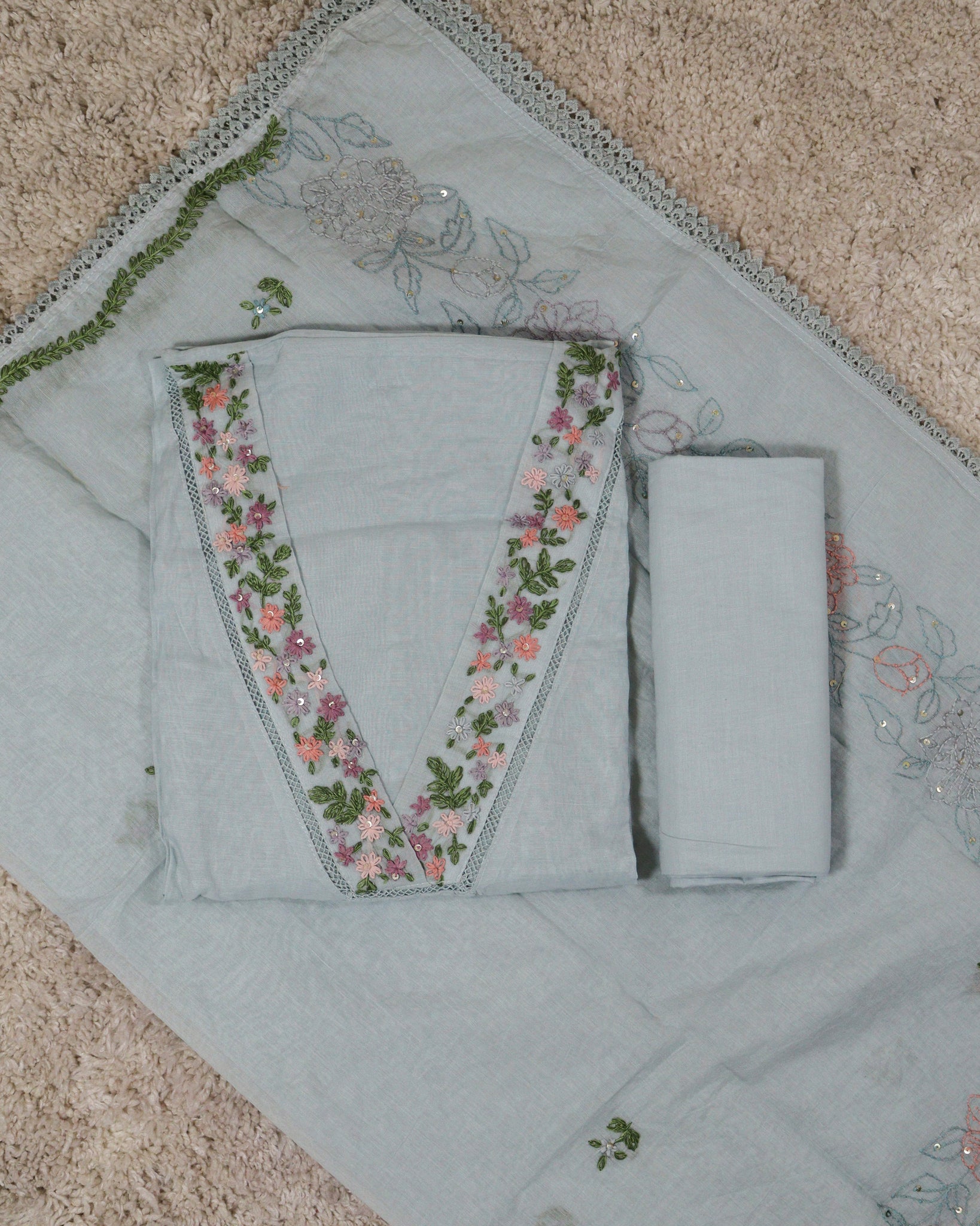 Dupatta: Mul chanderi dupatta with allover embroidery pattern. Sides finished with crochet lace. Length: 2.20mtr
