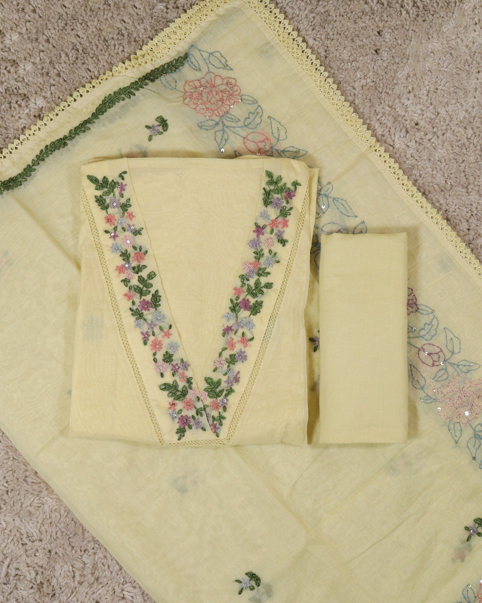 Top: Allover scattered embroidery motifs on front. Overlapped V-neck, Highlighted with embroidery detailing. Front hemline finished with crochet lace. Back plain. Length: 2.40mtr