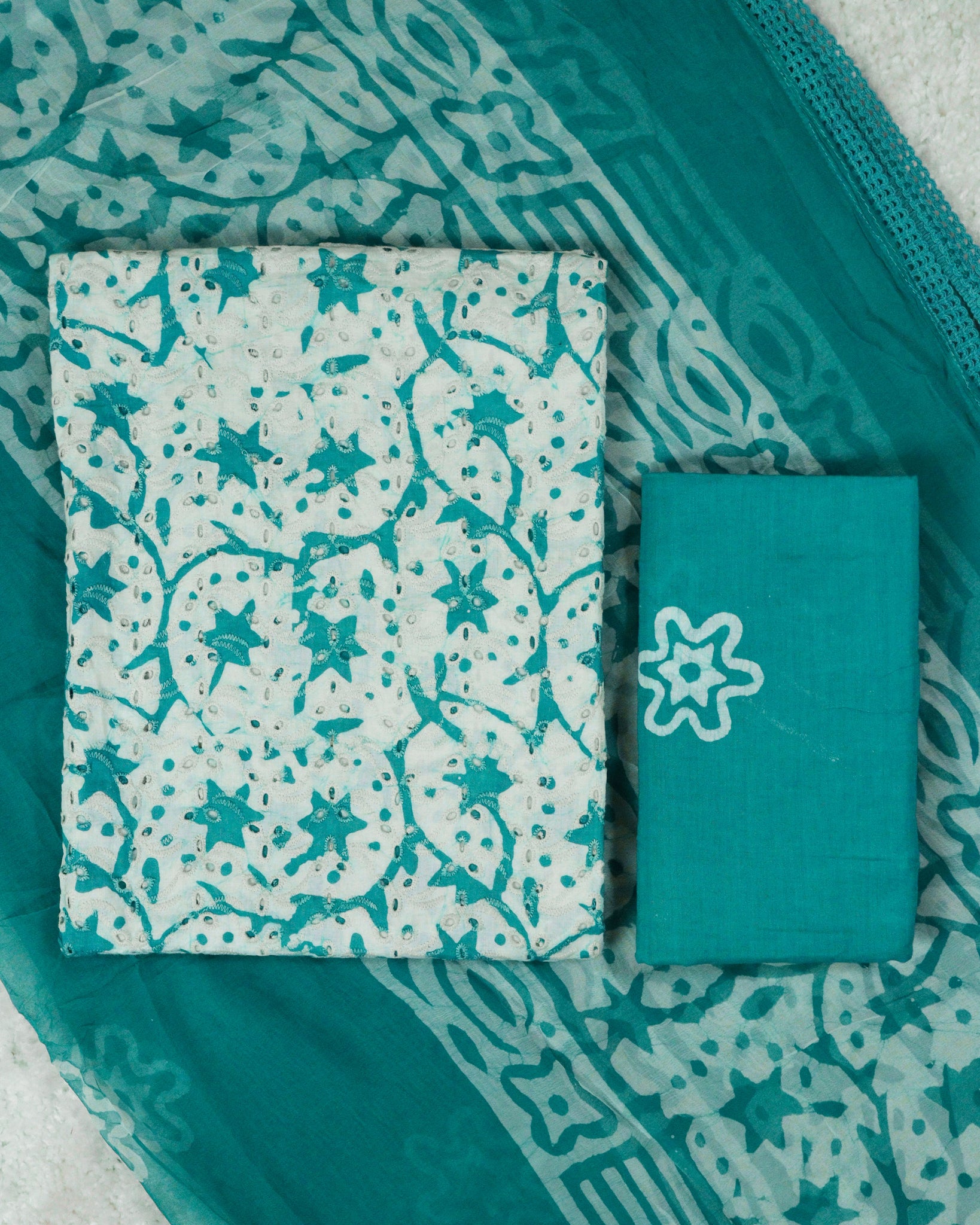 Dupatta: chiffon fabric with allover batik print. sides finished with lace. length:2.35mtr.
