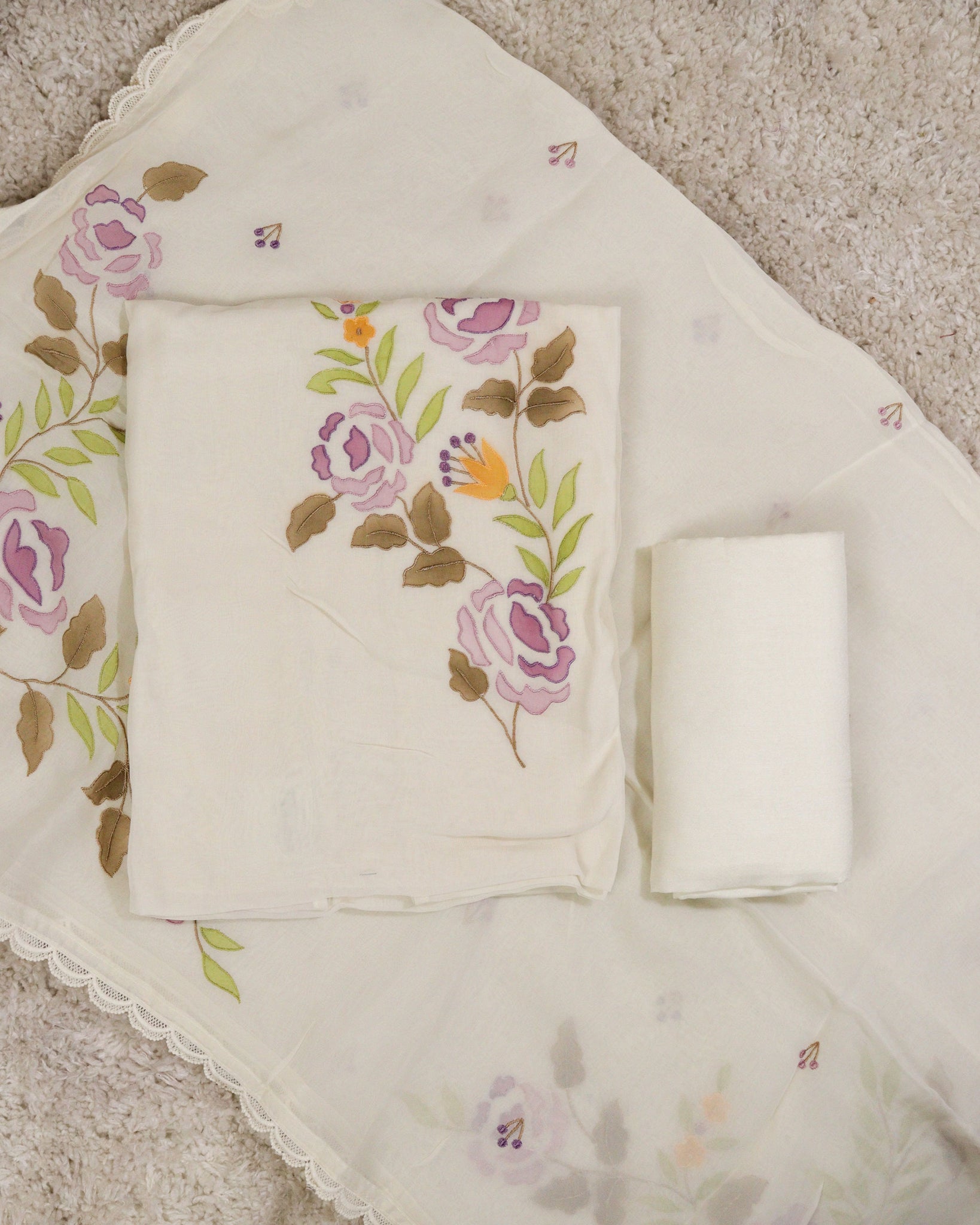 Top: Viscose Organza fabric enhanced with contrast color floral applique work. Hemline and sleeve ends finished with crochet lace is attached . Back portion plain. Length:2.40mtr.