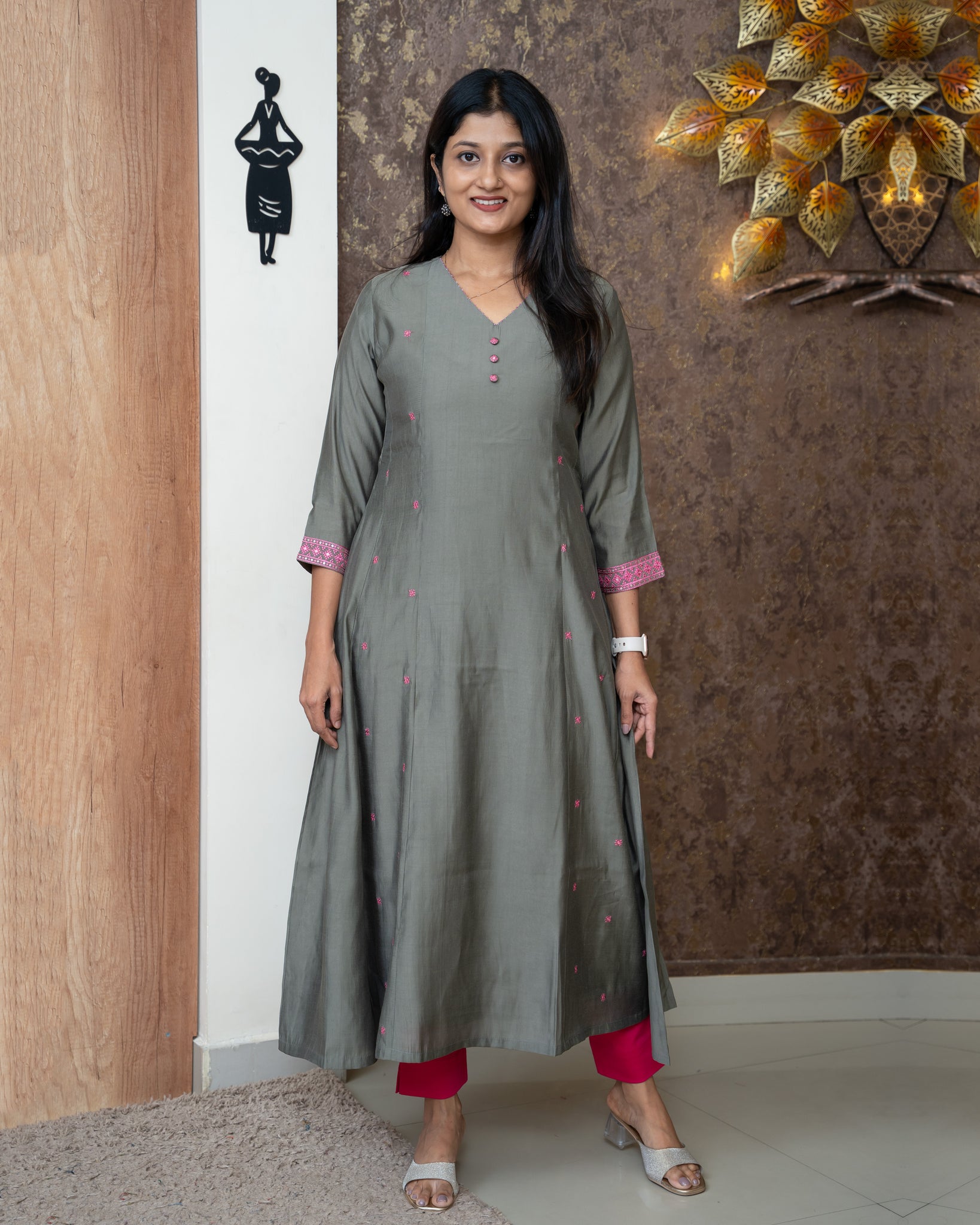 Top: A-line kurti with panel cut on both front and back. Front feature contrast embroidery detailing and buttons. Sleeve ends finished with contrast boarder. With lining.