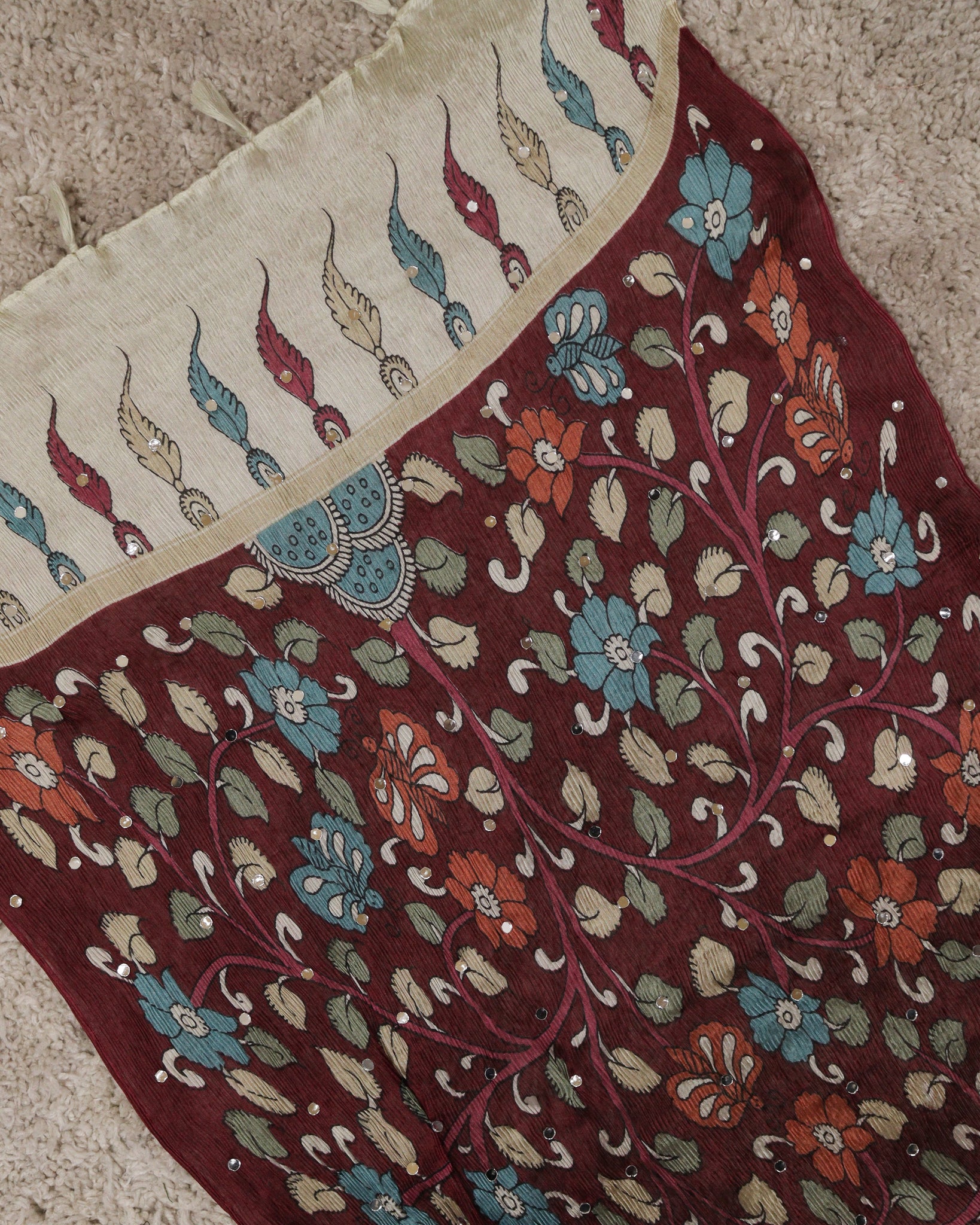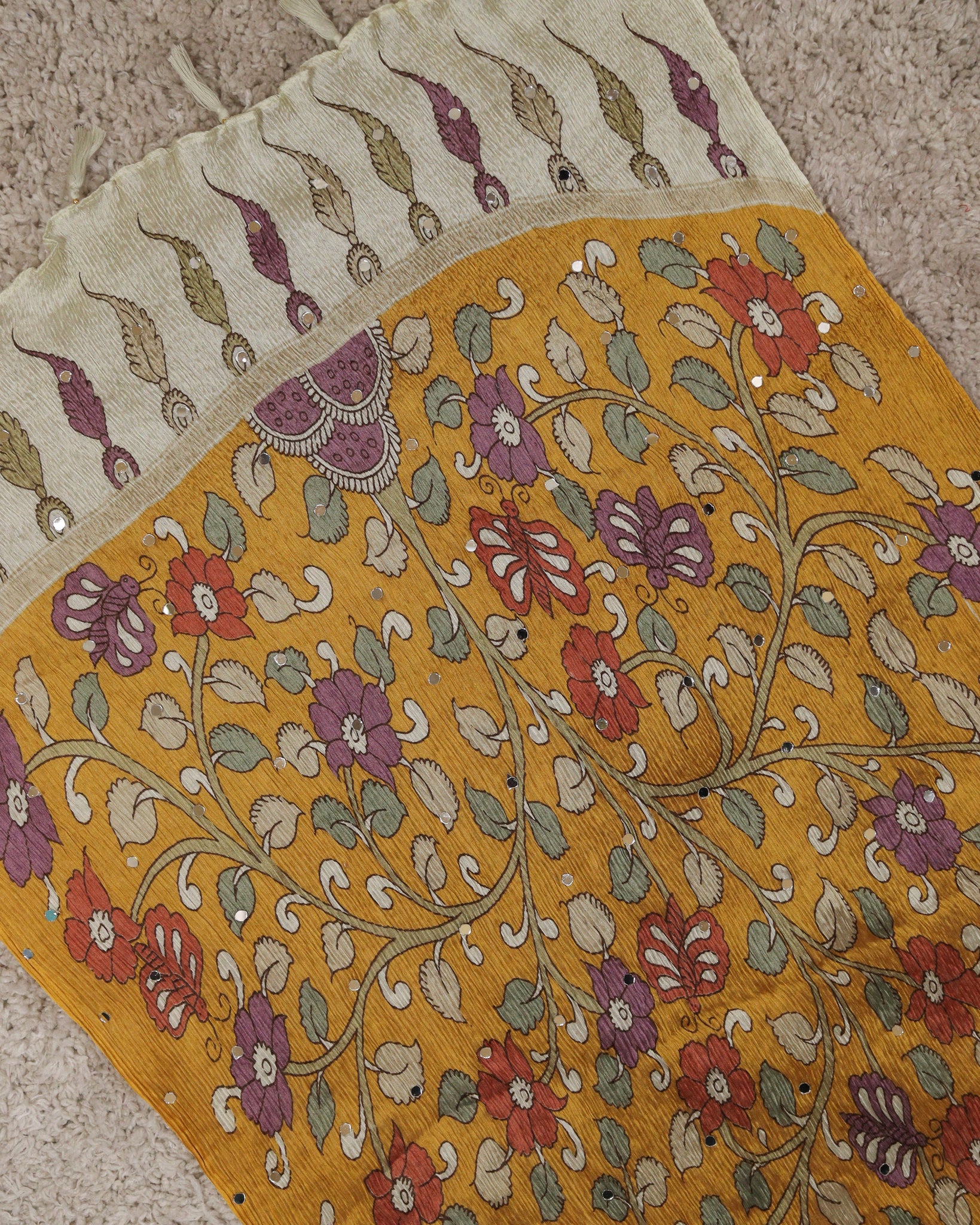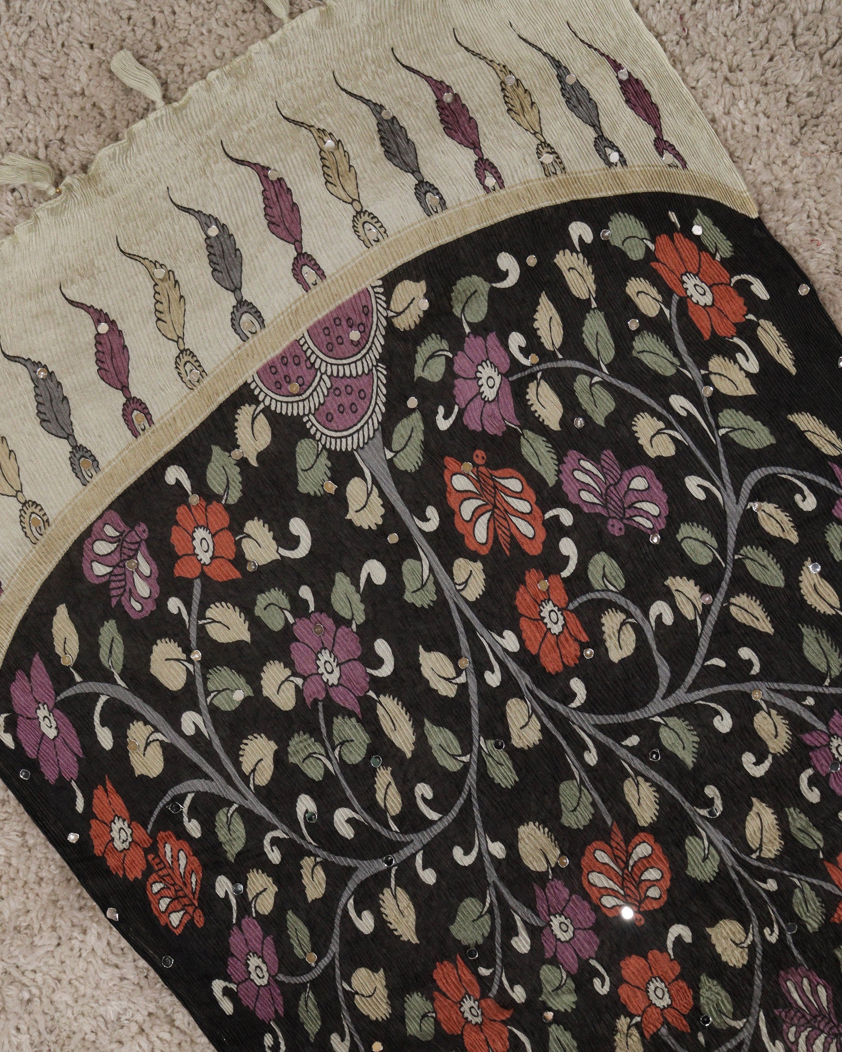 Chiffon dupatta with allover floral digital printed and mirror work detailing. Length: 2.20mtr