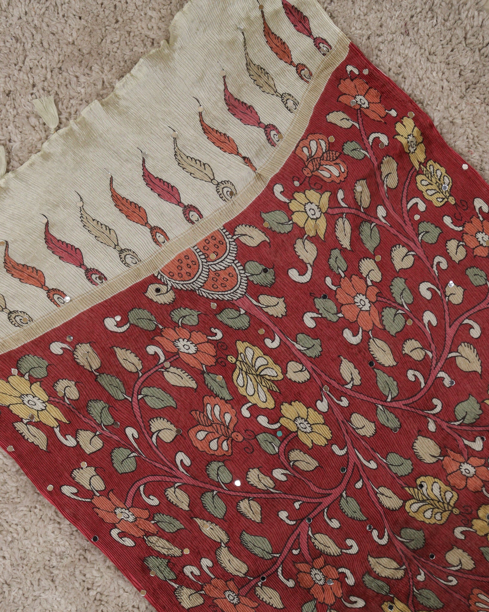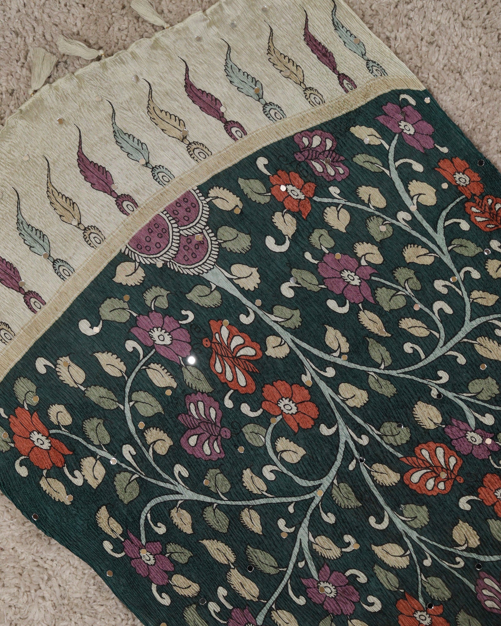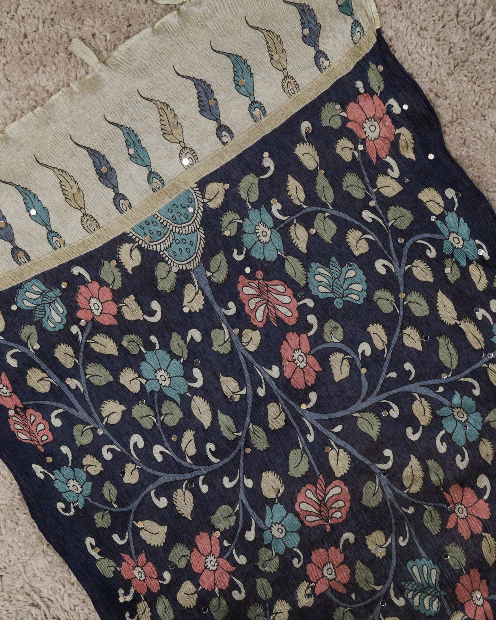 Chiffon dupatta with allover floral digital printed and mirror work detailing. Length: 2.20mtr