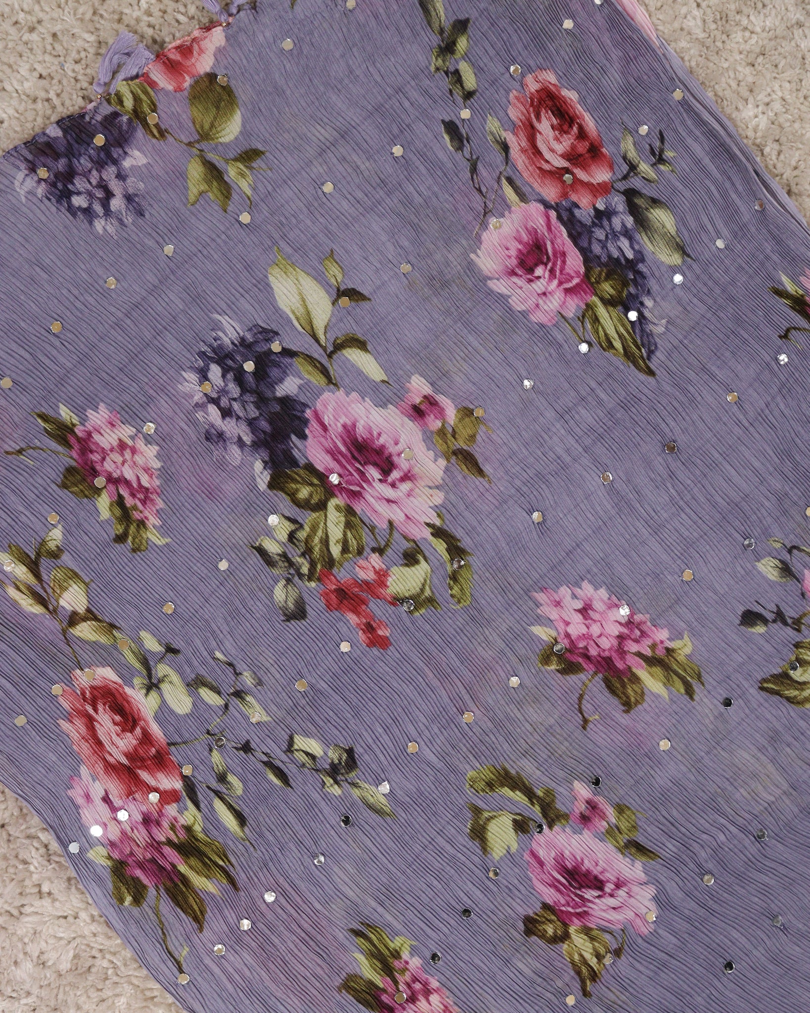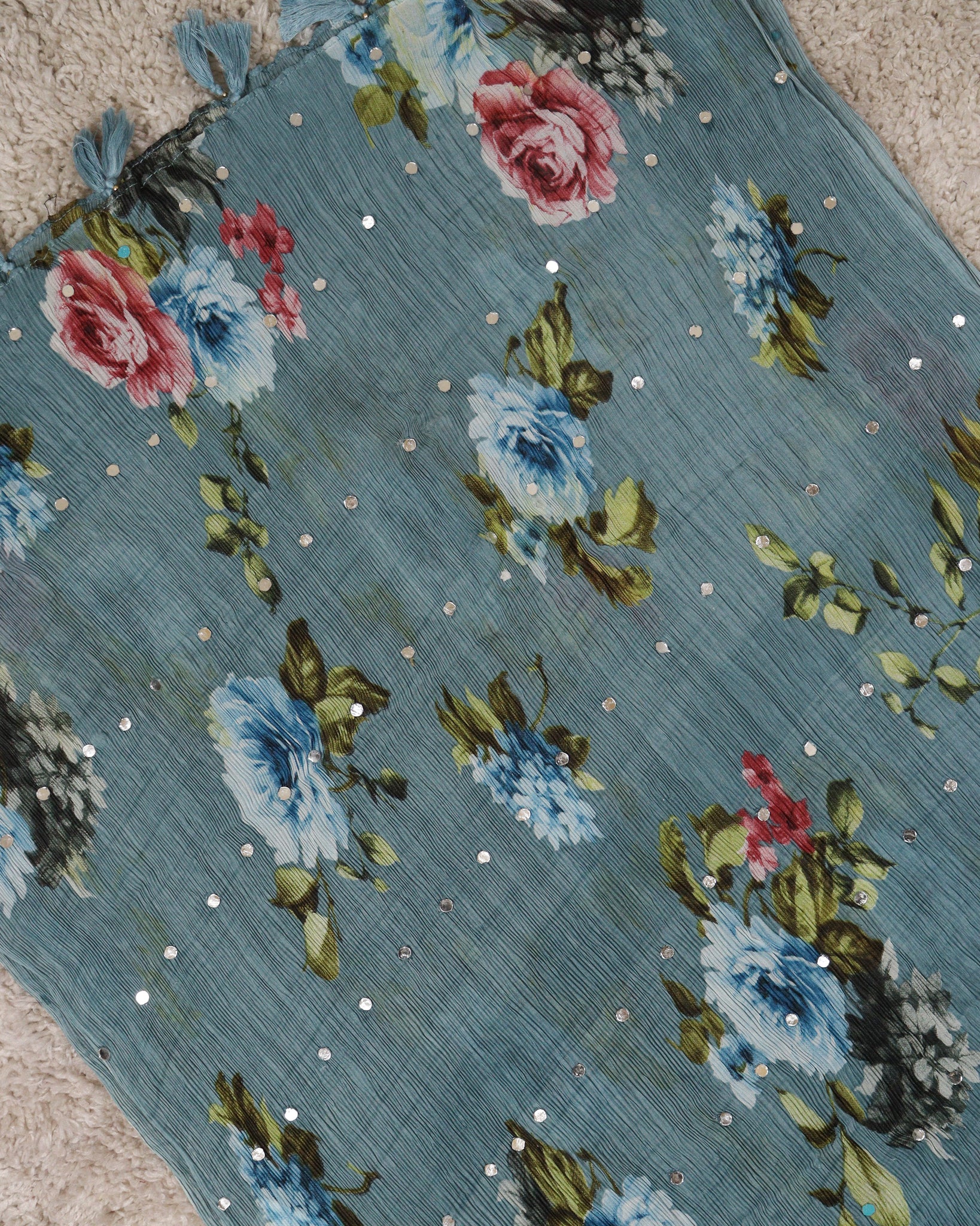 Chiffon dupatta with allover floral digital printed and mirror work detailing. Length: 2.10mtr