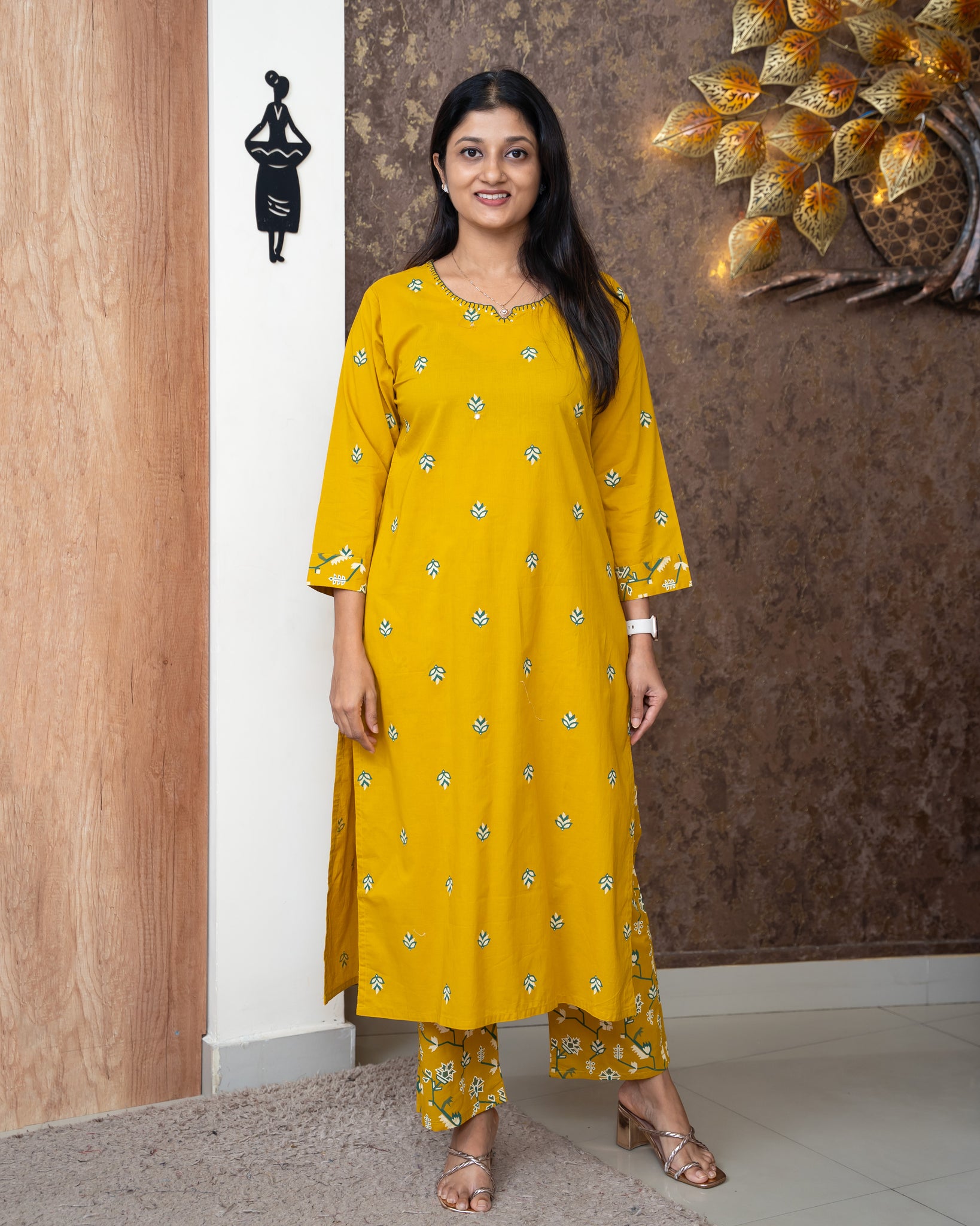 Top :-Slitted cotton kurti . Neck portion highlighted with handwork. Front and Back with butta print. Without lining
