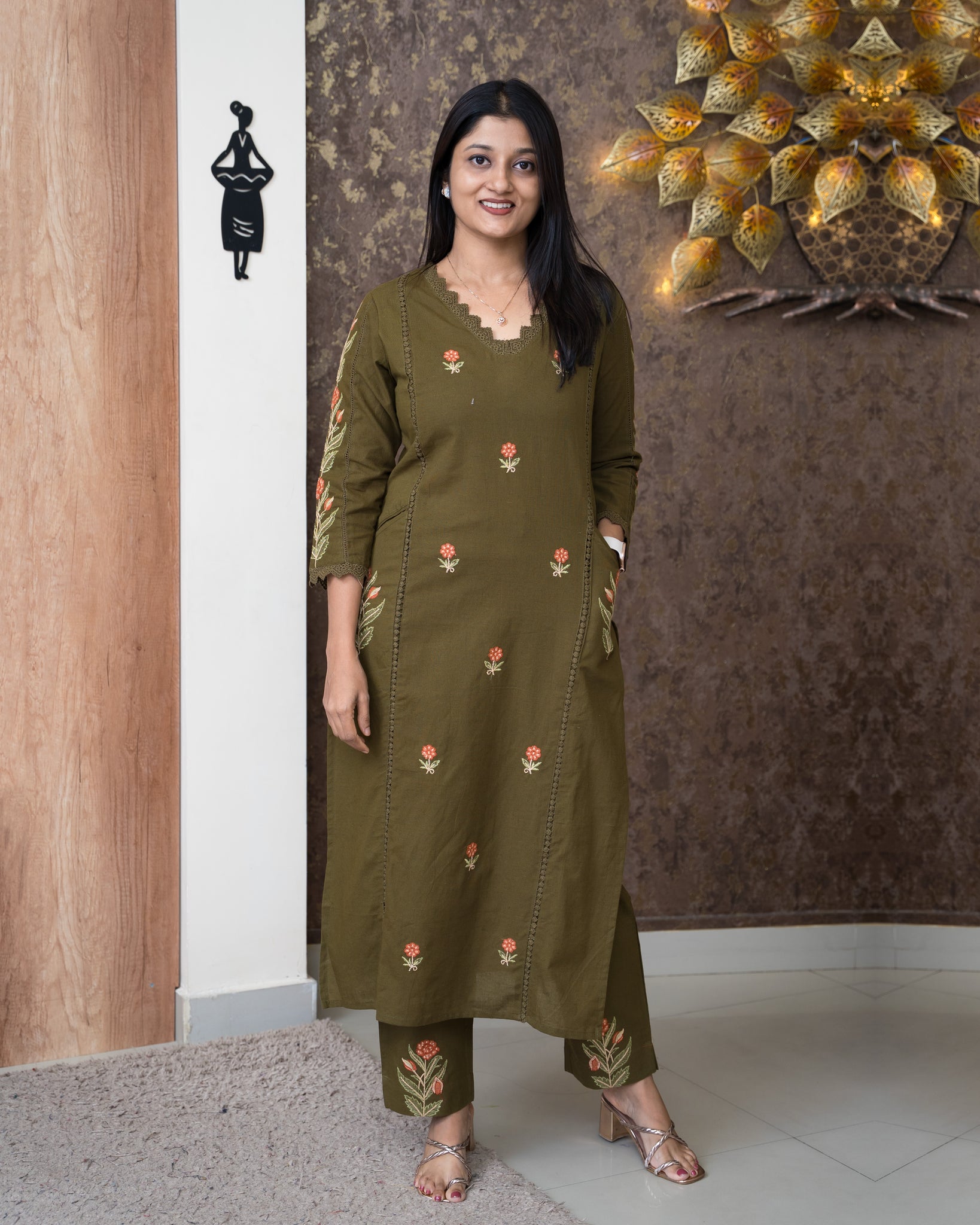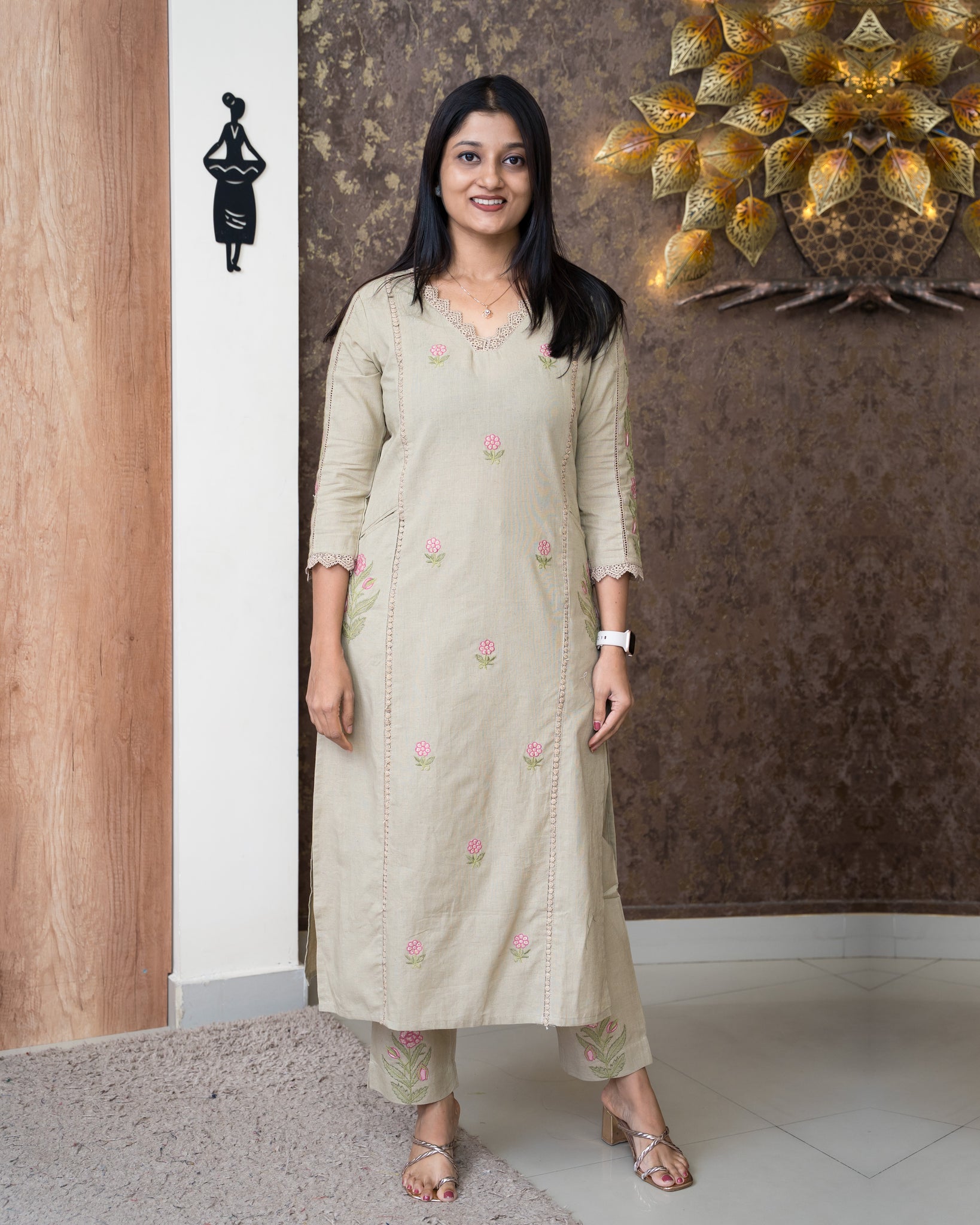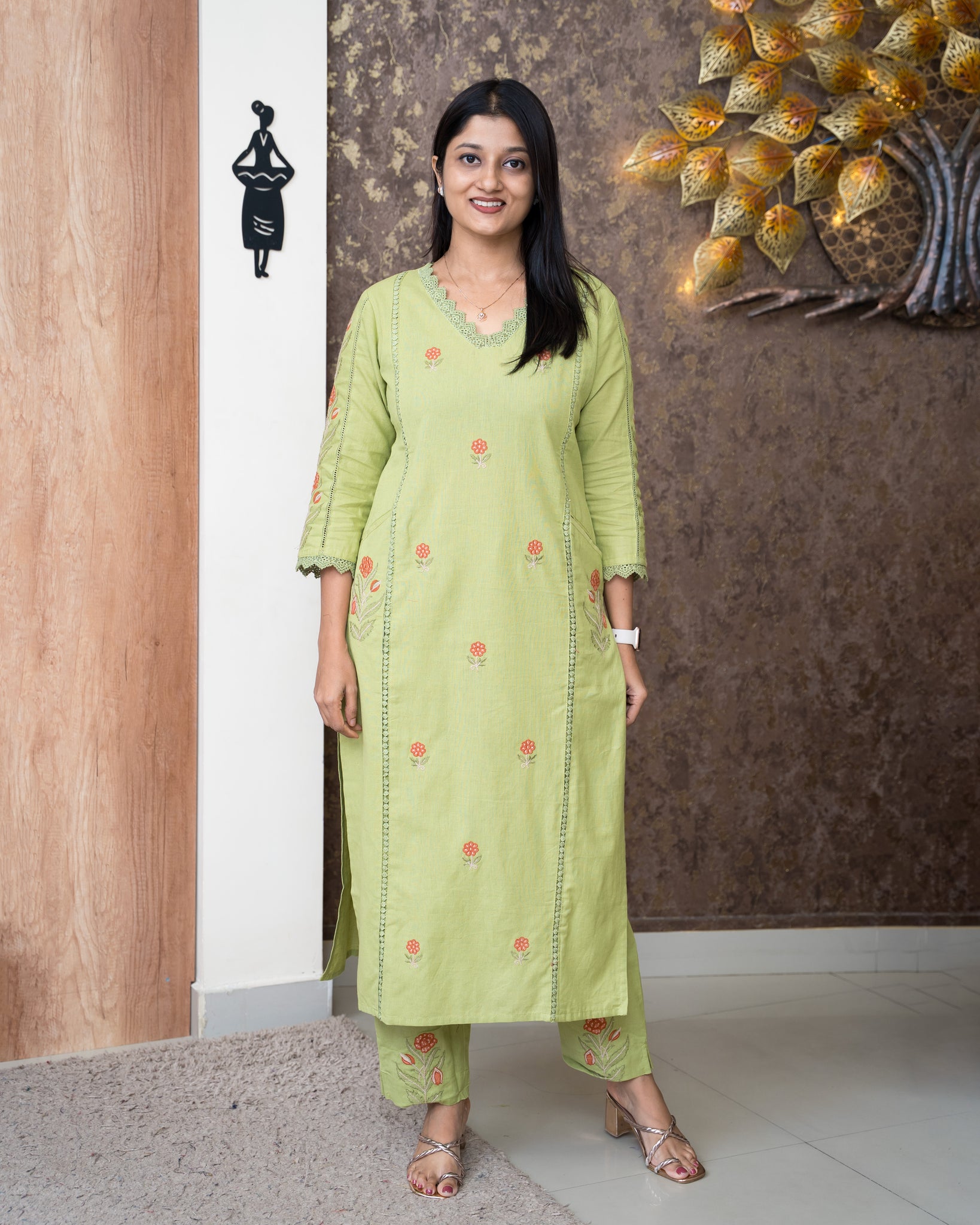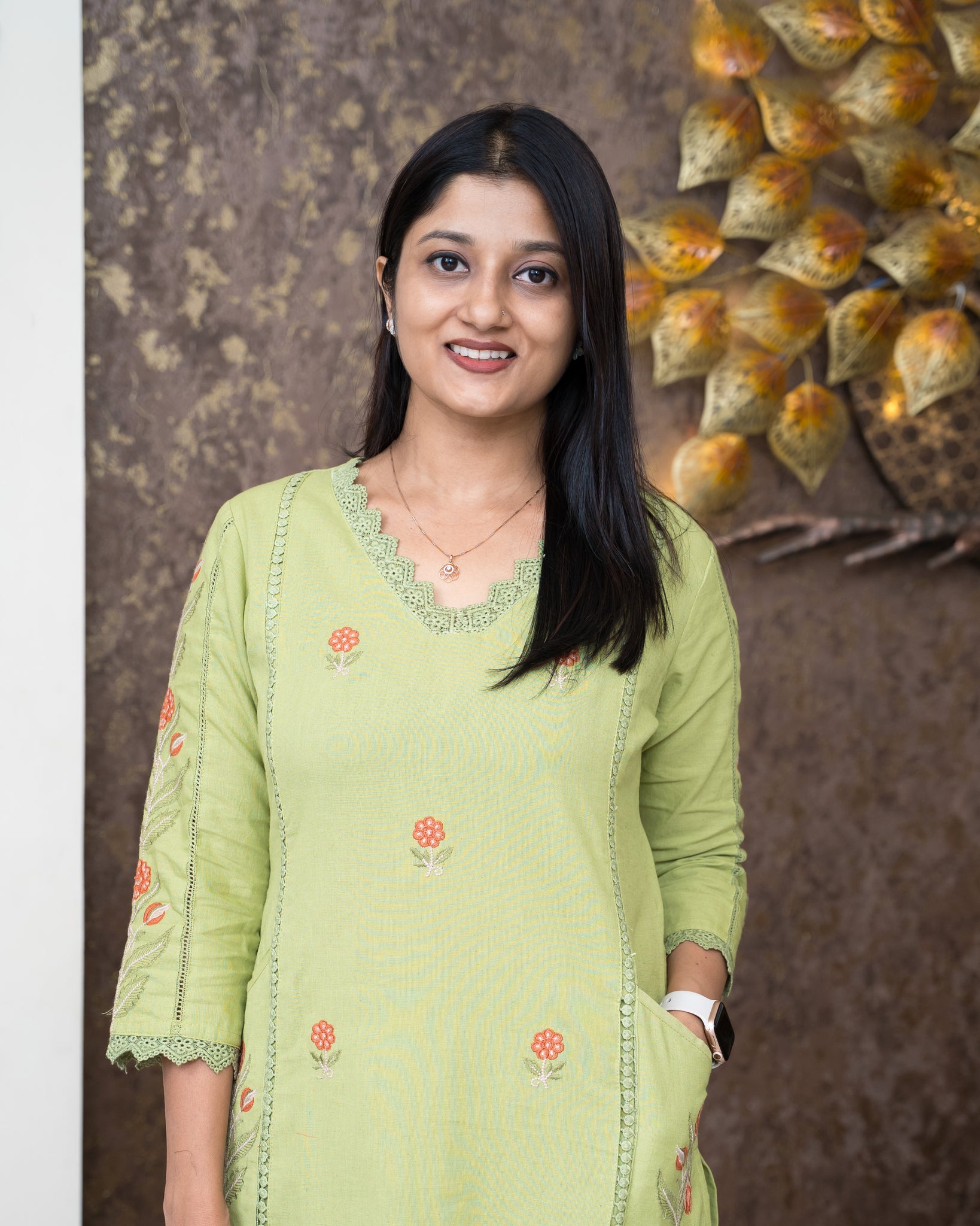 Top: Slitted kurti. Three panel cut on front. Front and sleeves features embroidery motifs and lace detailing. Neck and sleeve ends finished with lace. Pockets on both side panels. Without lining.