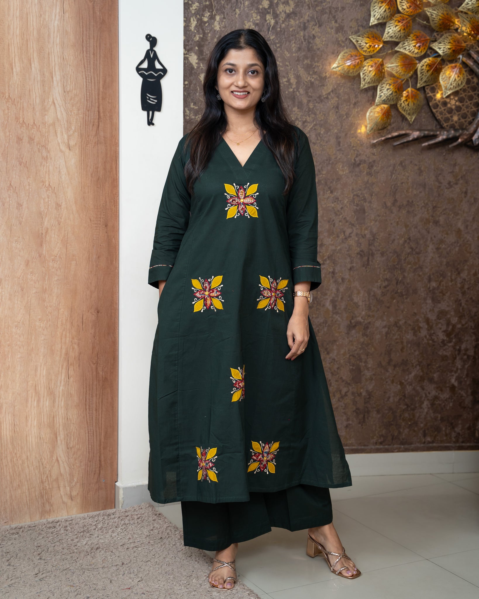 Top: A-line kurti. Front features applique work. Without lining.