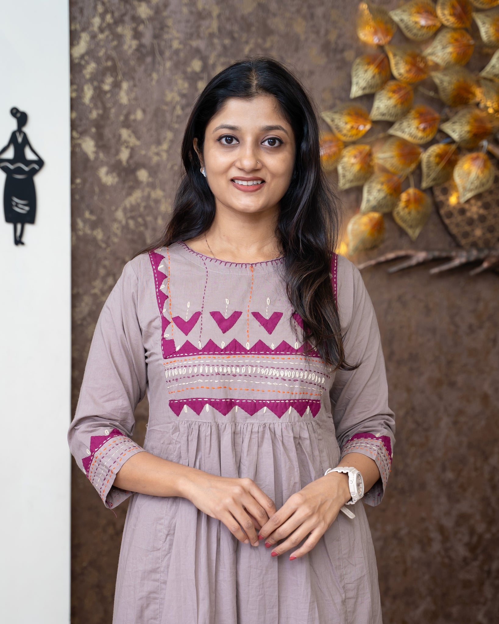 Top: A-line kurti. Yoke highlighted with applique work pattern and running stitches. Sleeve ends also highlighted with applique work and running stitches. Back yoke enhanced with applique work, running stitch and button detailing. Gathers at both front and back. Pockets on both sides. Without lining.