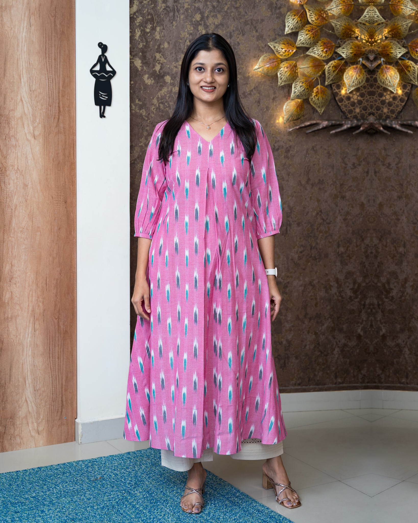 Top: A-line kurti with allover ikat woven pattern. Yoke features an inverted box pleat. Sleeve ends finished with gathers and boader. Without lining.