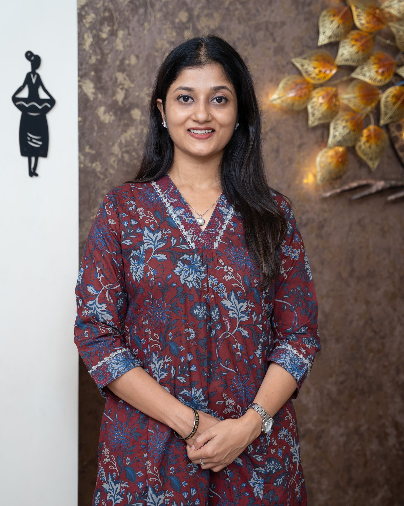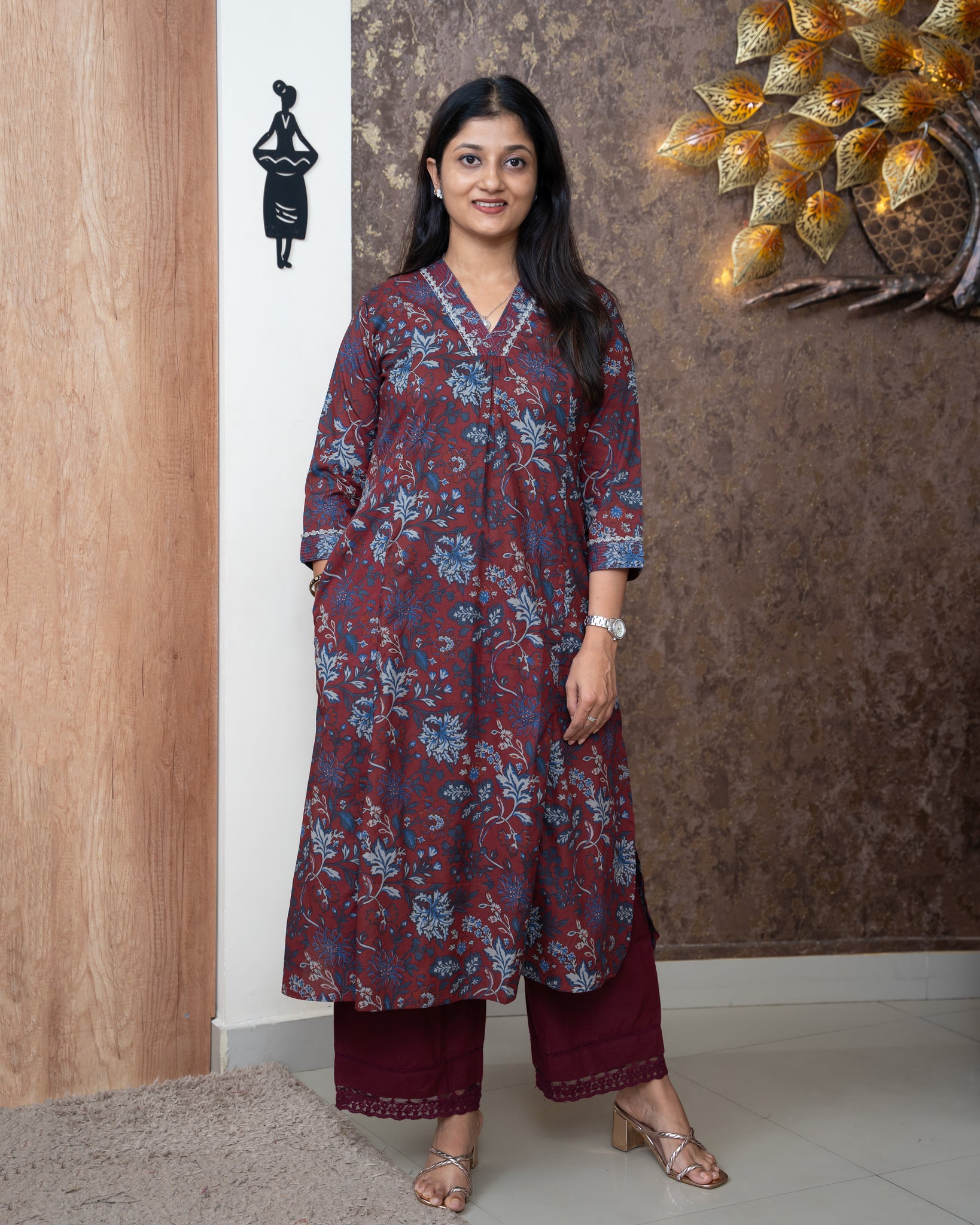 Top: Printed cotton slitted A-line kurti. Three panel cut on front. Overlapped V-neck. Neck and sleeve ends highlighted with running stitched and crochet lace. One side pocket. Without lining.