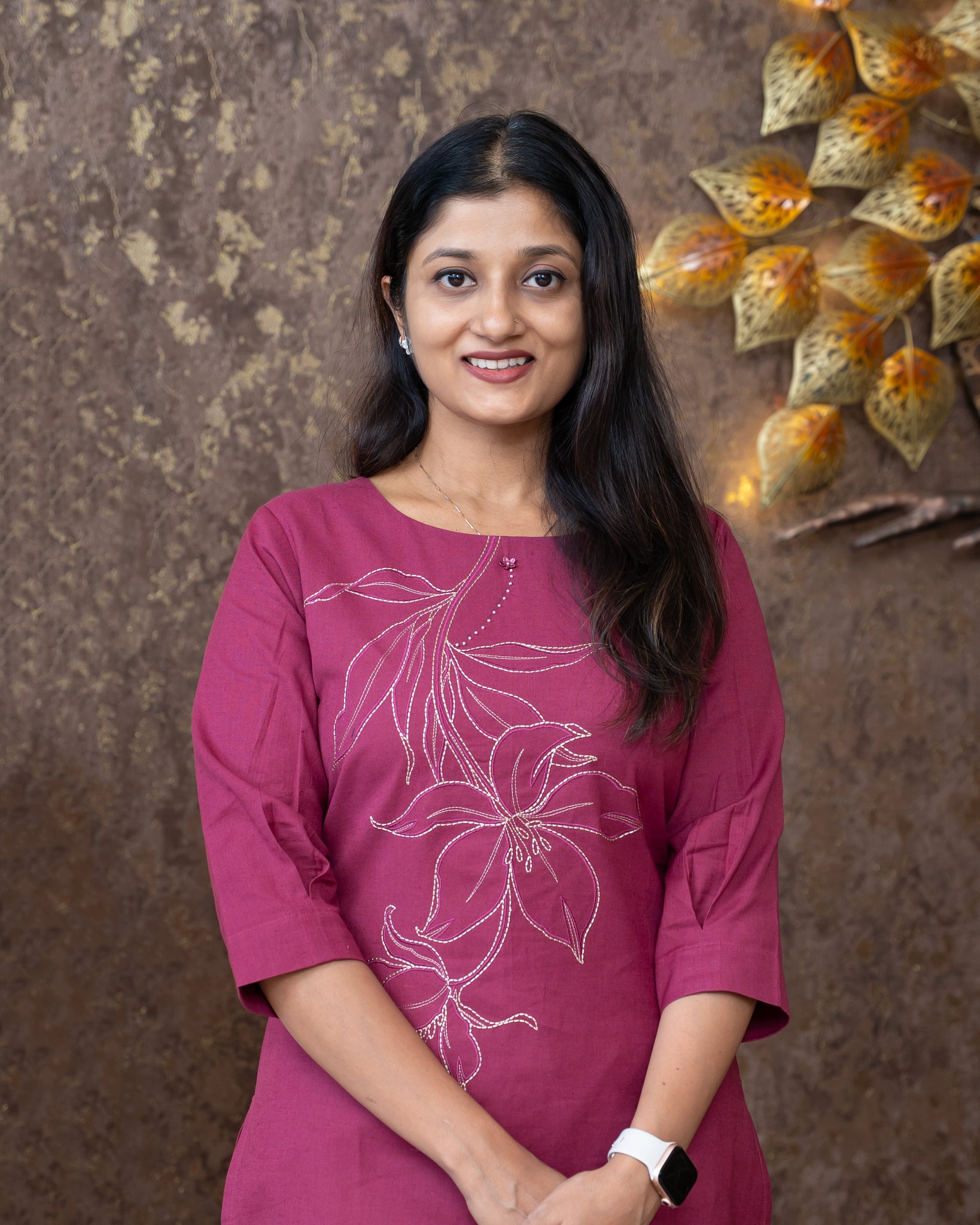Top: Slitted kurti. Front features a floral thread work motif. Sleeve ends finished with a box pleat boarder. Without lining.