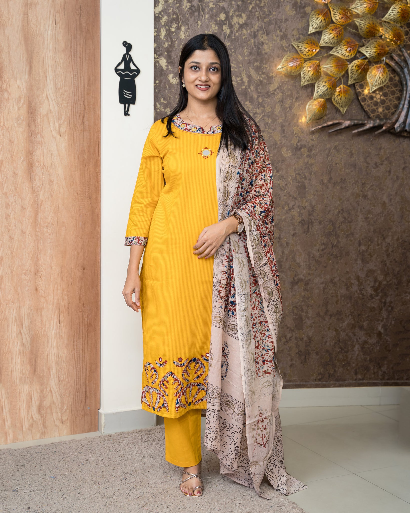 Top: Slitted kurti with allover striped woven pattern. Neck features a pattern with kalamkari fabric. Hemline highlighted with applique work. With lining(cotton).