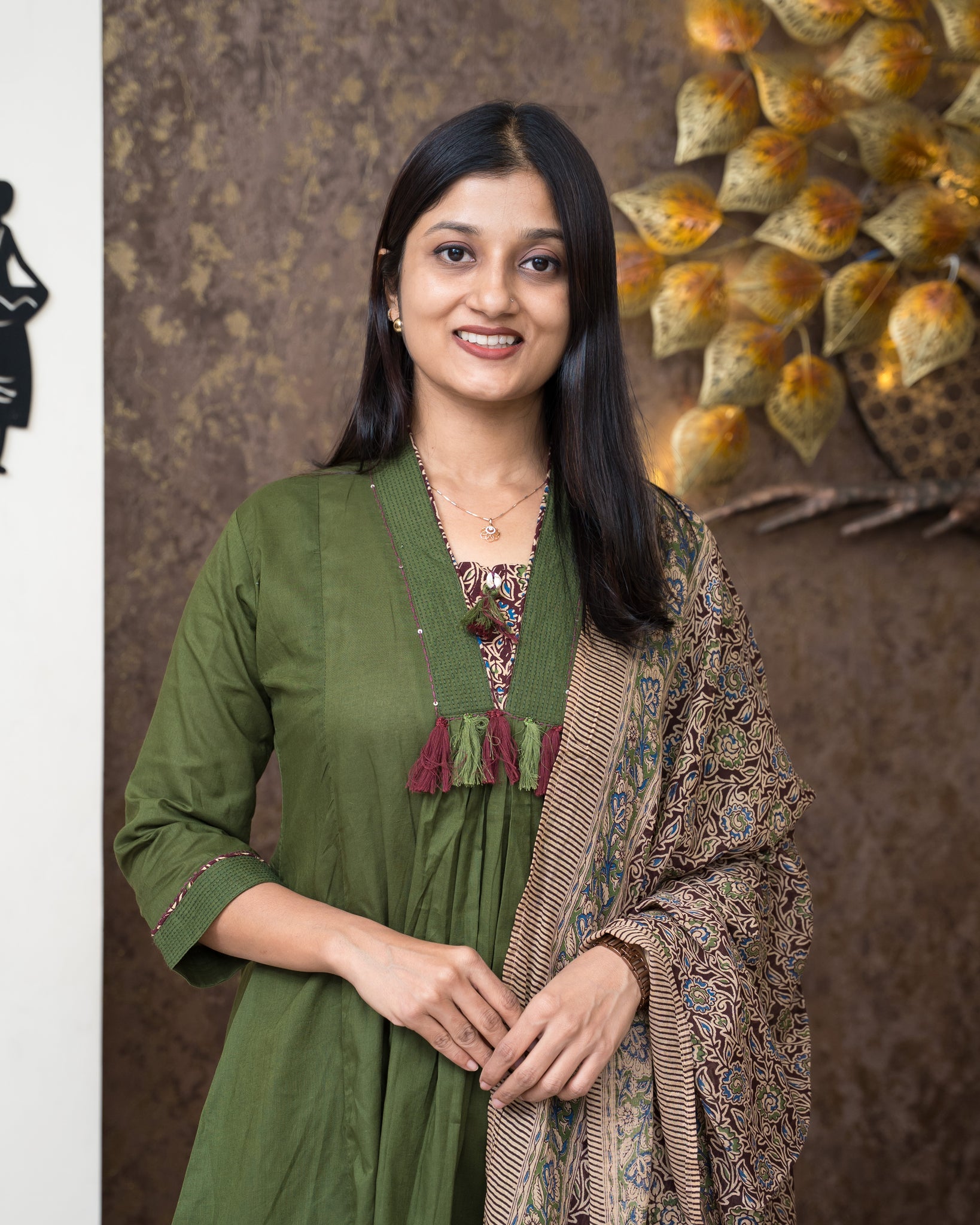 Top: A-line kurti. V-collar neck. Front also features a gathers. Without lining.