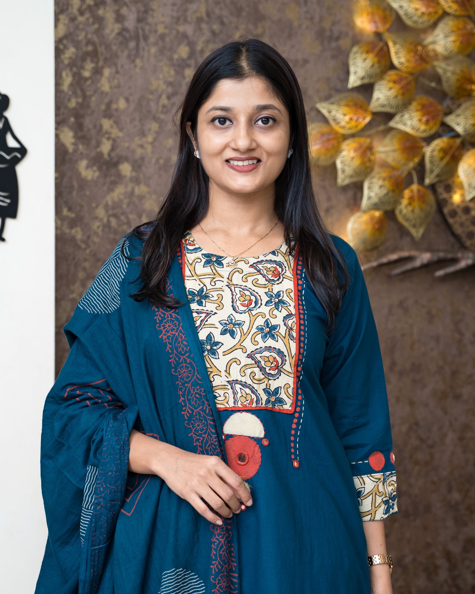 Top: A-line kurti. Yoke crafted in printed cotton fabric, highlighted with block print, mirror work and kantha stitches. Sleeve ends features printed fabric and block prints. Without lining.