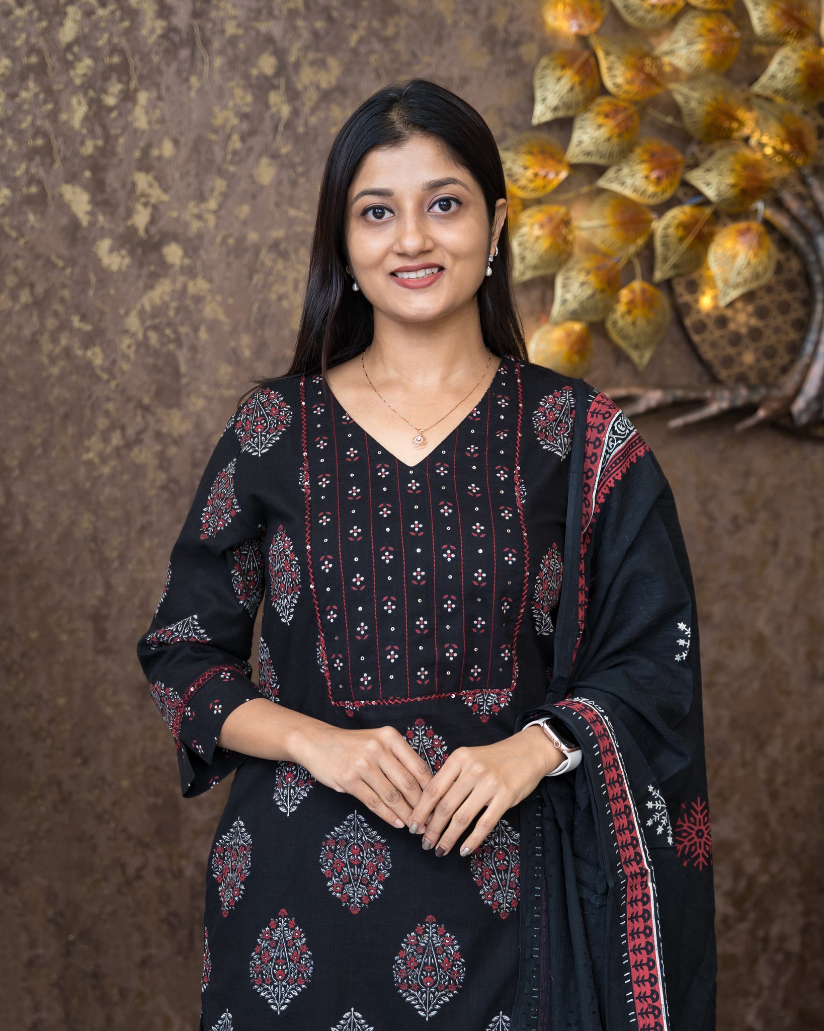 Top: Slitted A-line kurti. Allover printed motifs. Yoke highlighted with small prints and running stitches. Sleeve ends finished with boarder and a slit. Without lining.