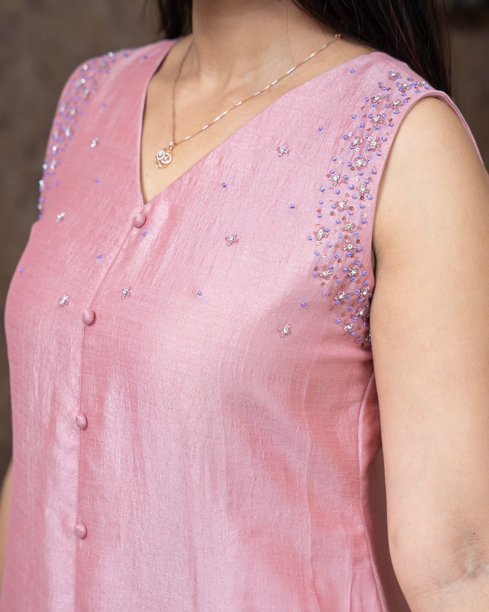 Top: A-line kurti. Front features a slit pattern and potli buttons. Yoke and sleeves highlighted with hand work detailing. Back plain A-line. Plain sleeves are available for with sleeves. With lining(crepe).