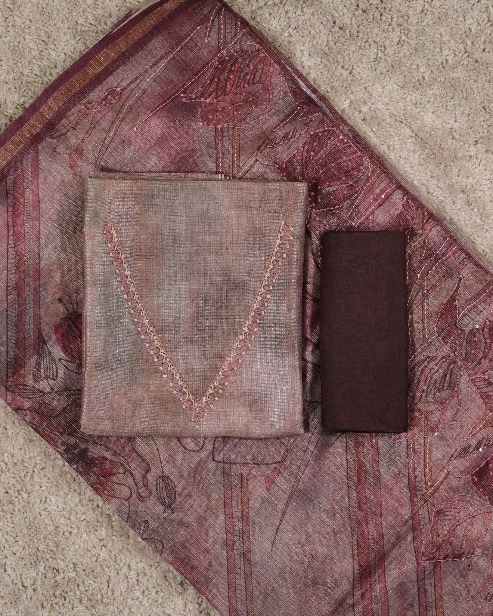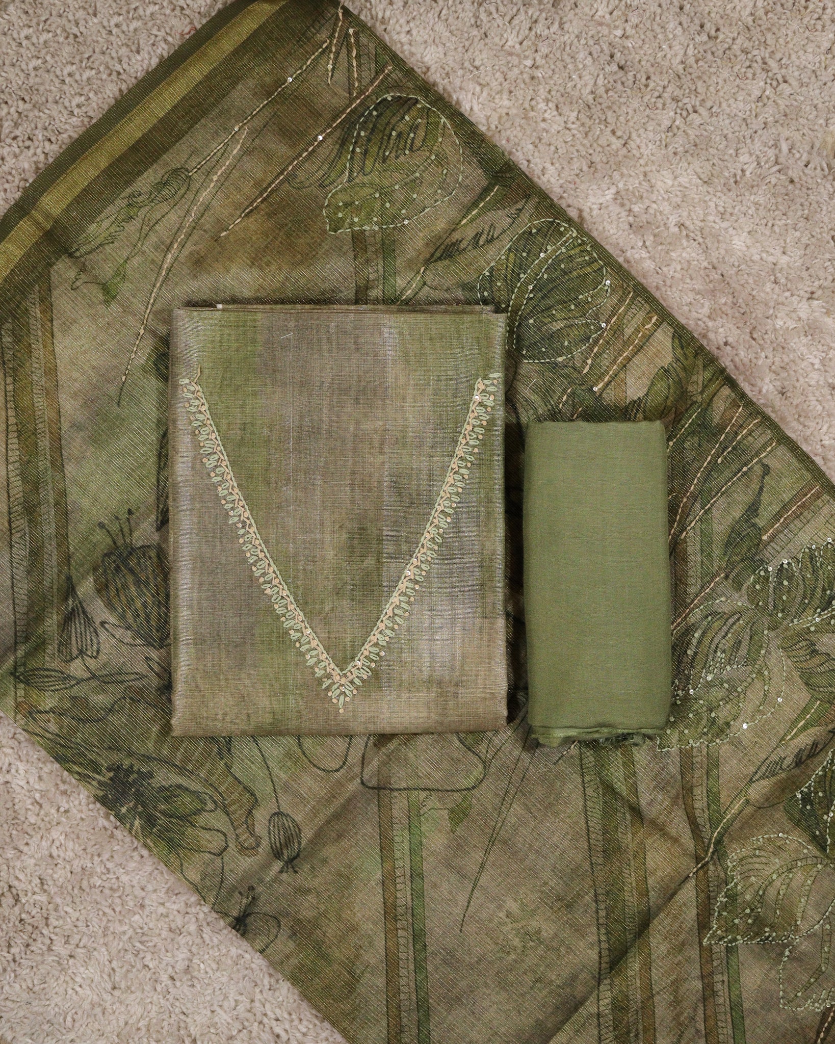 Top: Line tissue fabric with digital prints. neckline and hemline enhanced with handwork.. Length: 2.50mtr