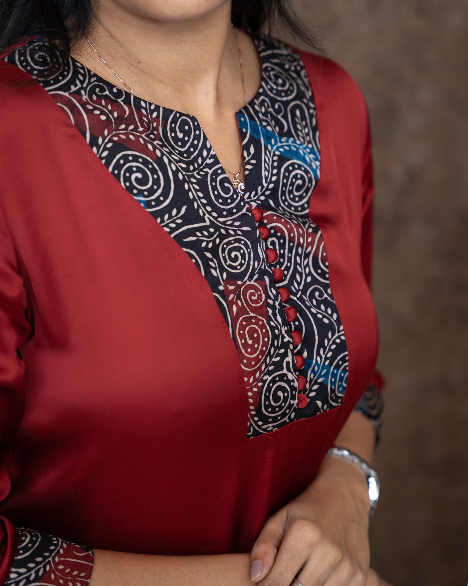 Top: Modal silk A-line kurti. Yoke crafted with printed modal fabric and potli buttons are attached. Sleeve ends finished with printed modal silk boarder. With lining.