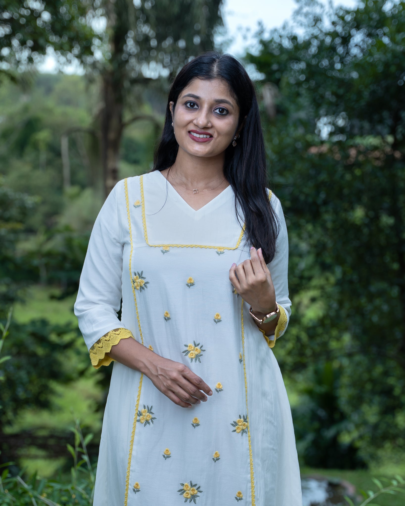 Top: Mul chanderi A-line kurti. Three panel cut on front. Middle panel crafted with embellished fabric. Crochet lace attached between panels and yoke. Sleeve ends also finished with lace. Back plain A-line. Without lining.