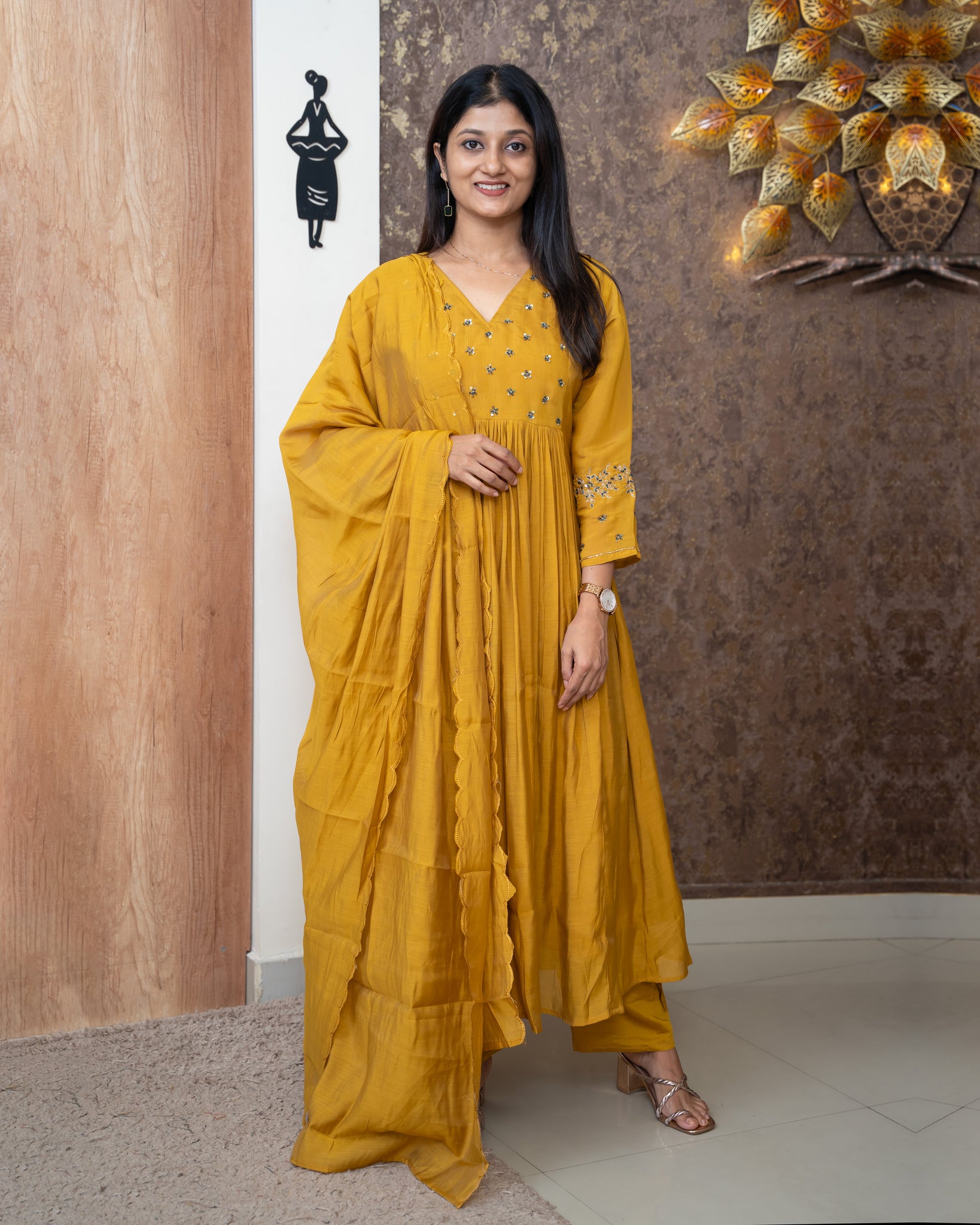 Dupatta: Mul Chanderi dupatta. Sides finished with scallop. Length: 2.20mtr