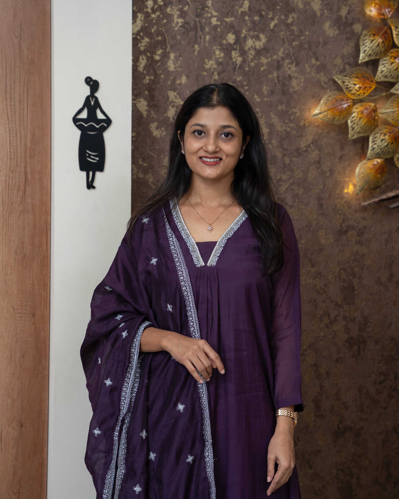 Top: Mul chanderi A-line kurti. Neck highlighted with with handwork detailing. Small gathers attached with neck. With lining.