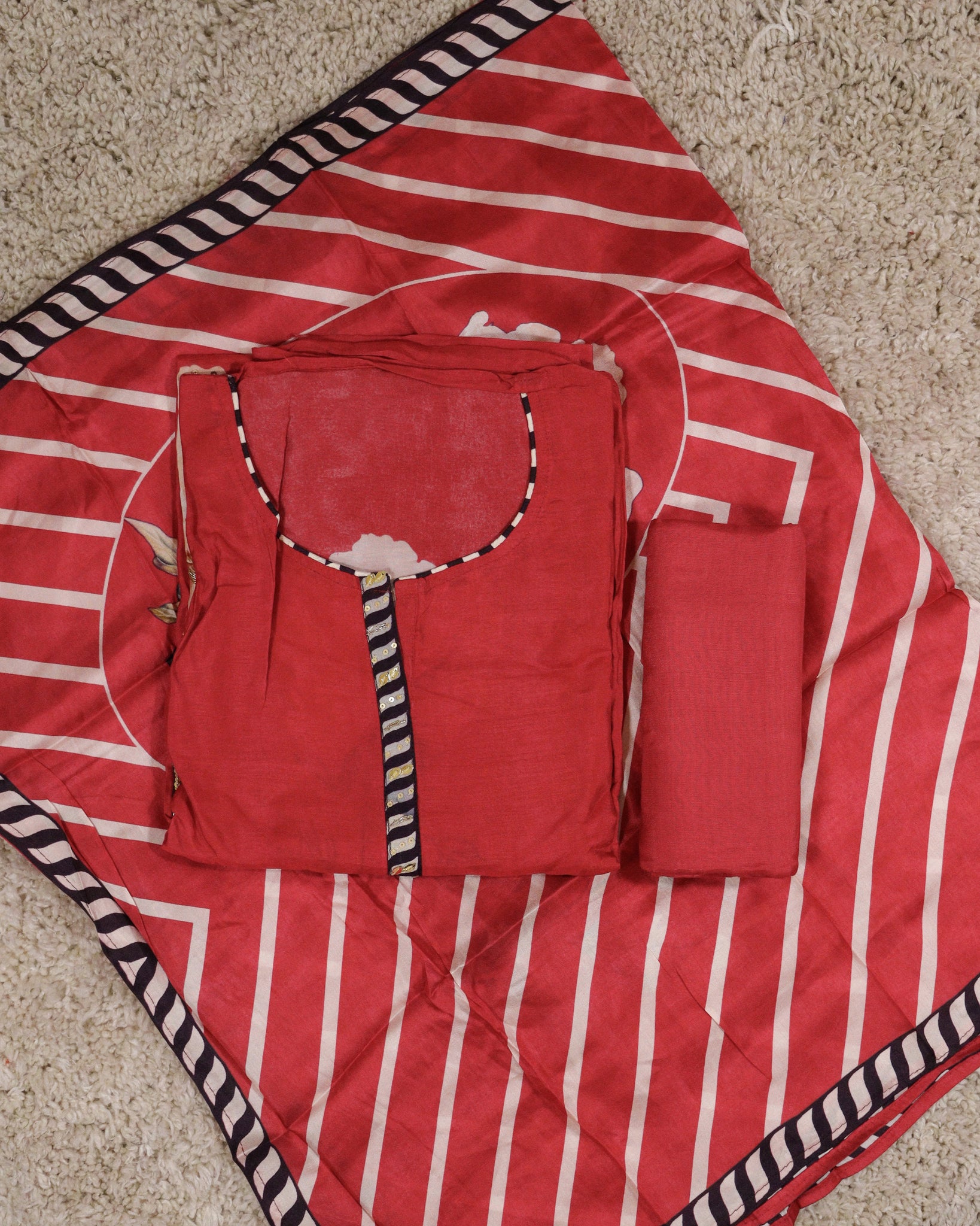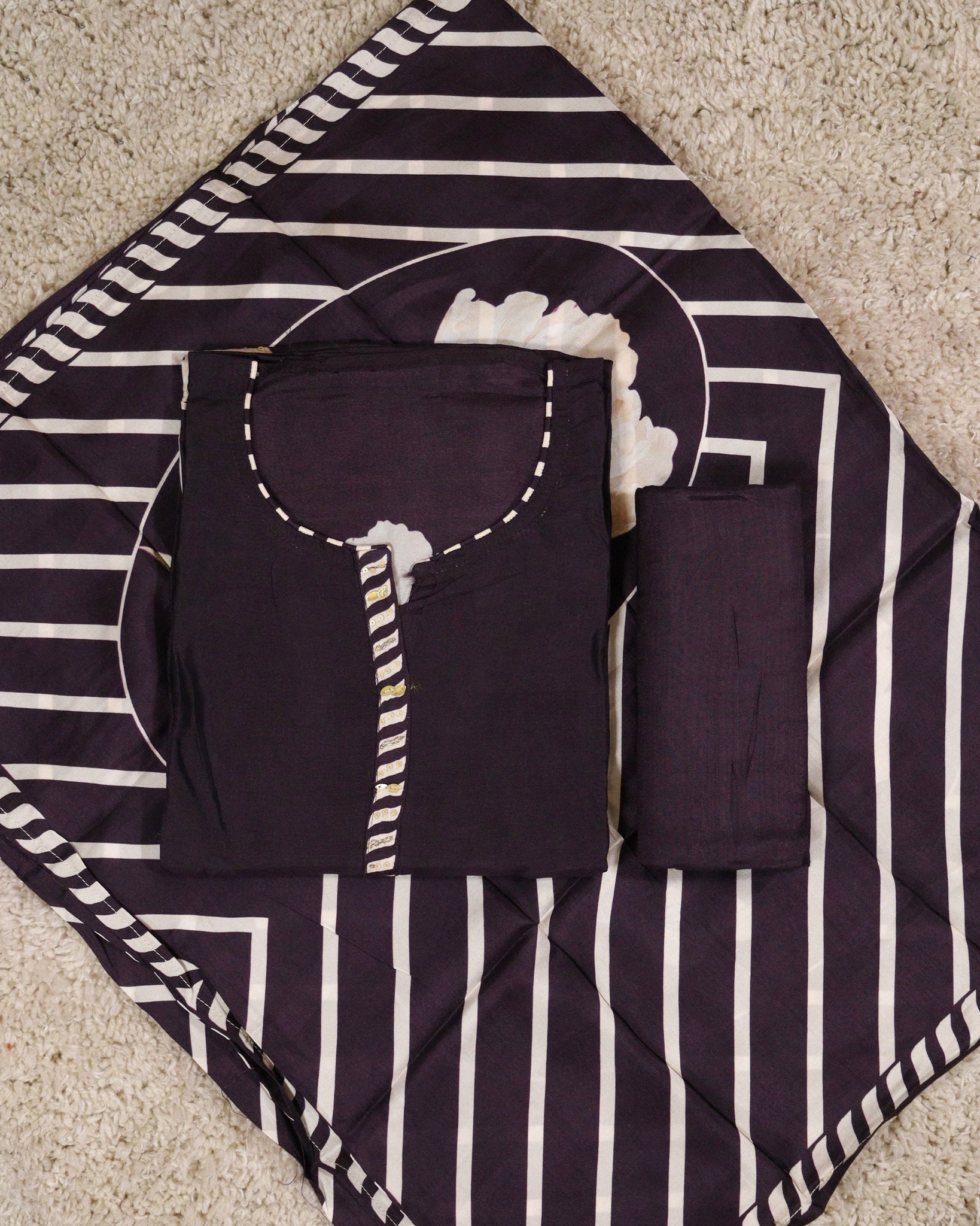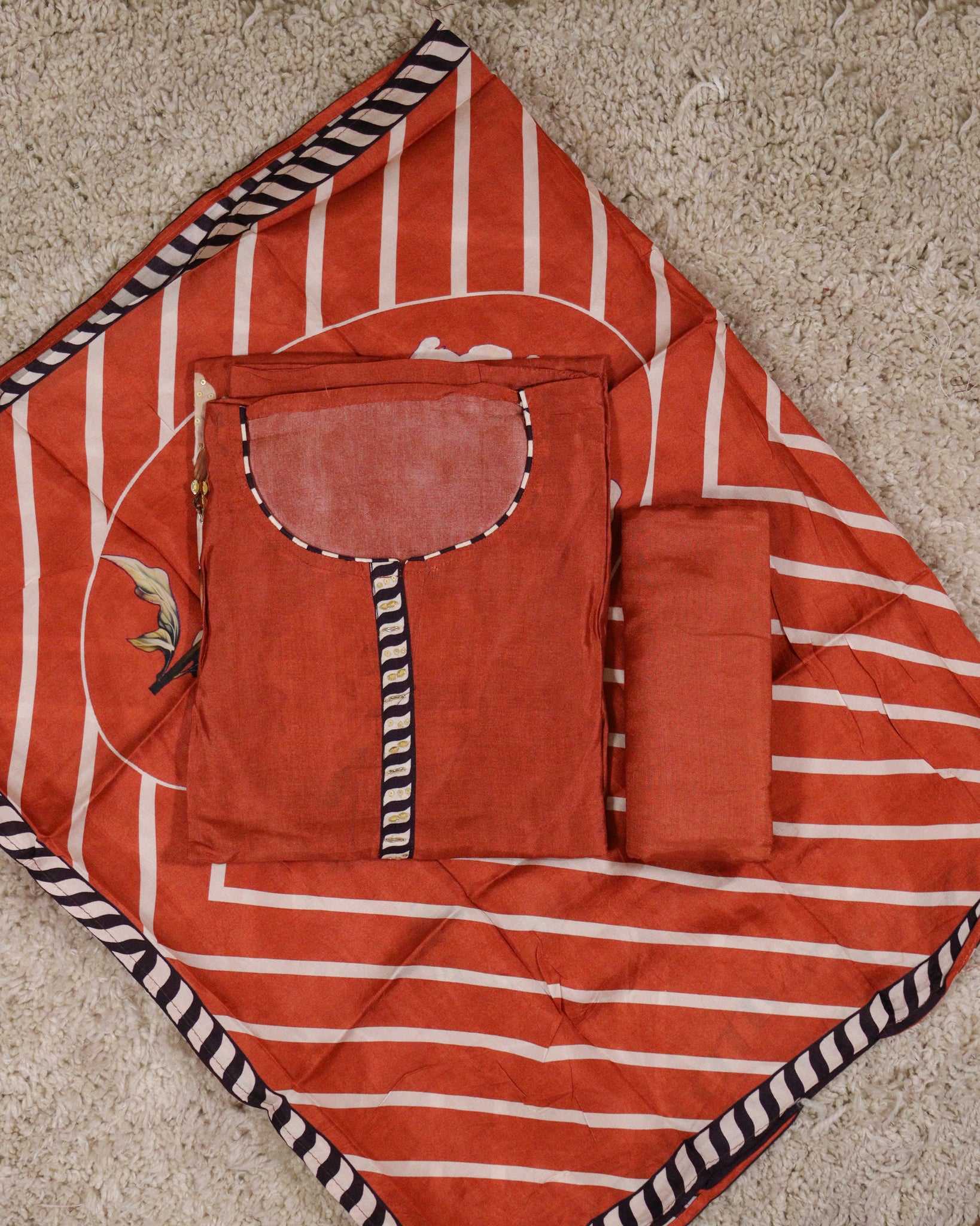 Top: Muslin silk fabric. Round neck with a placket pattern. Front features a floral printed motif, highlighting with hand work. Back side also have a floral printed motif. Length: 2.20mtr