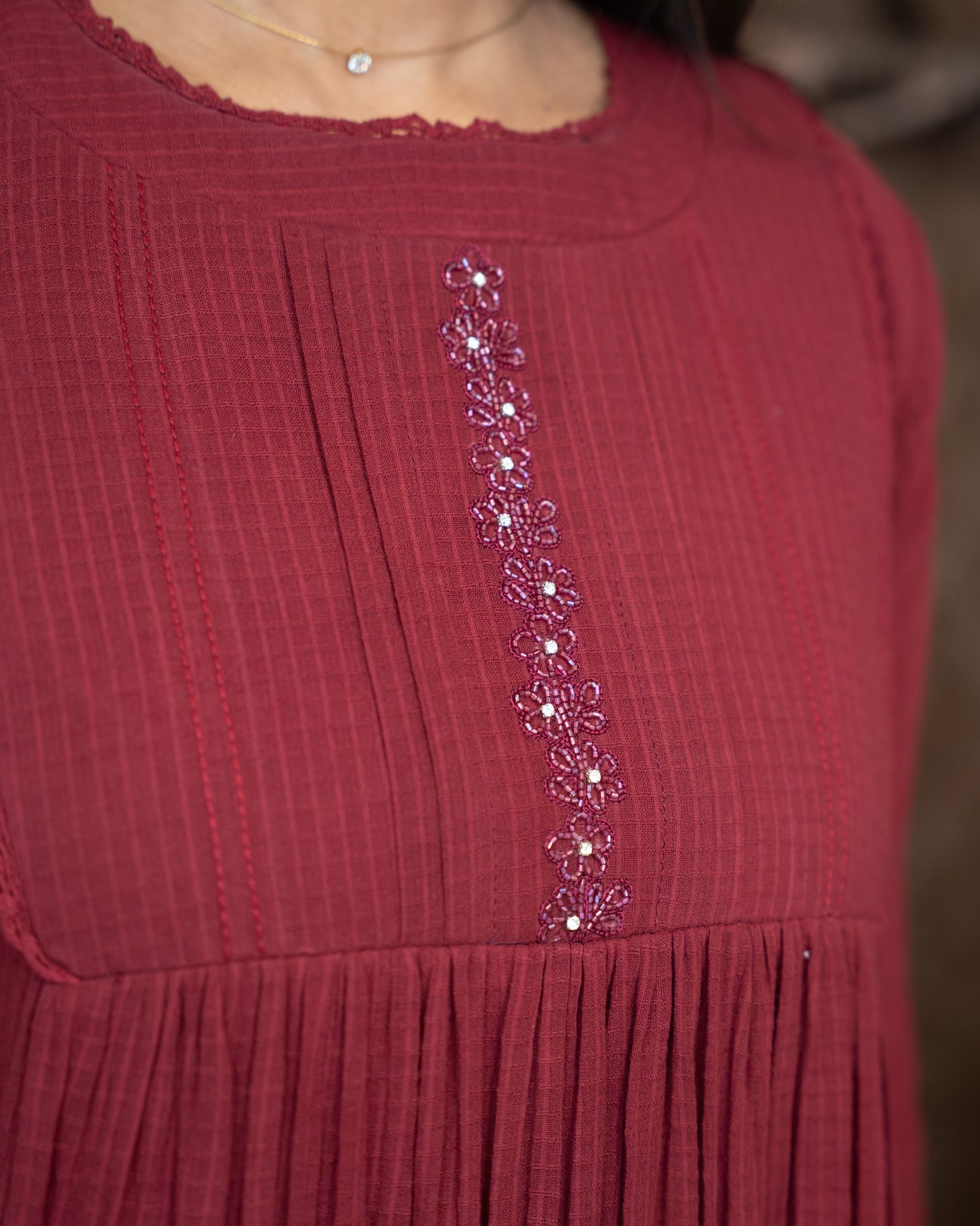 Top: Check cotton A-line kurti. Box yoke enhanced with pleats, embroidery detailing and crochet lace. Full round collar neck. Sleeve ends also features pleats. Small gathers at front. With lining.