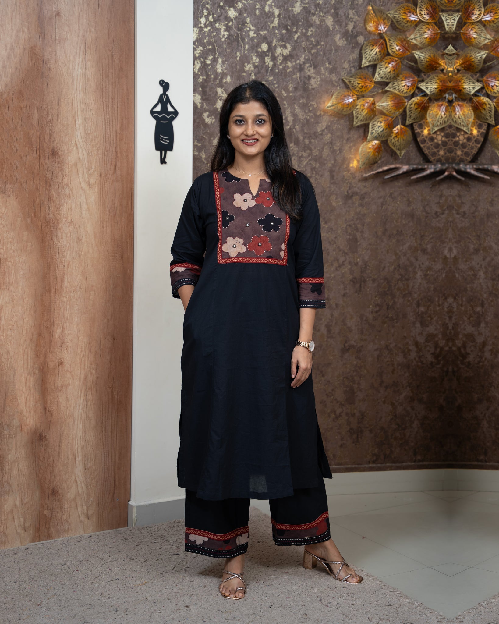 Bottom: Pure cotton parallel bottom. Hemline finished with hand block printed fabric.