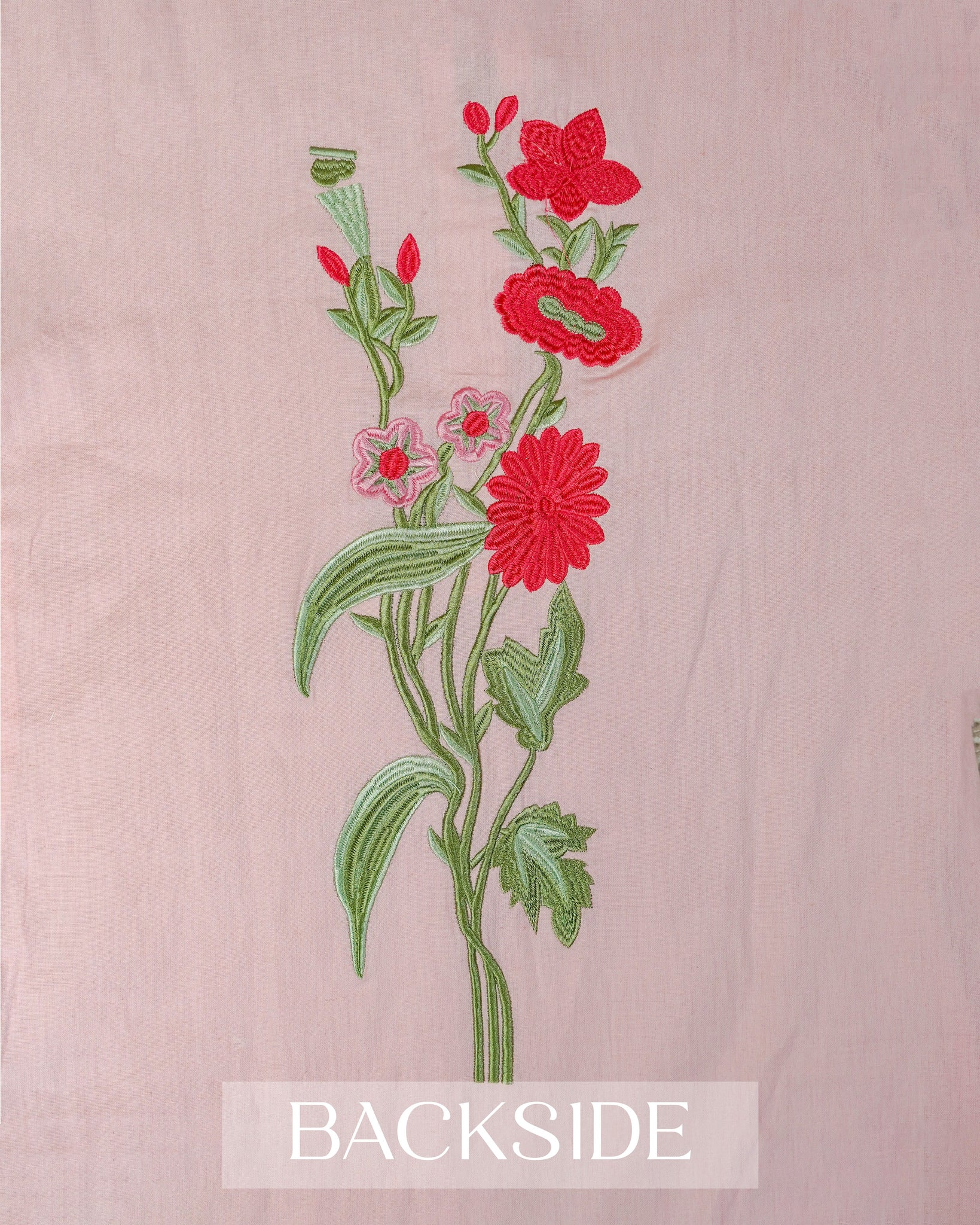 Top: Pure Cotton slitted kurti. flat collar, yoke portion enhanced with loop and parle attached. sleeve and back enhanced with floral machine embroidery. without lining.
